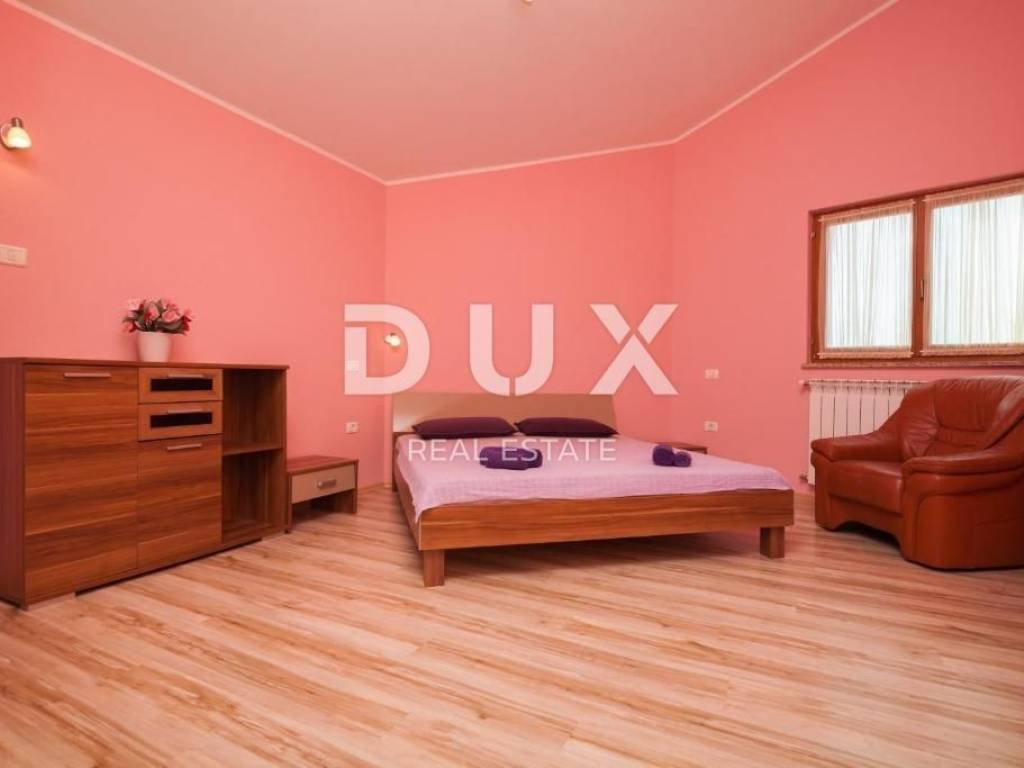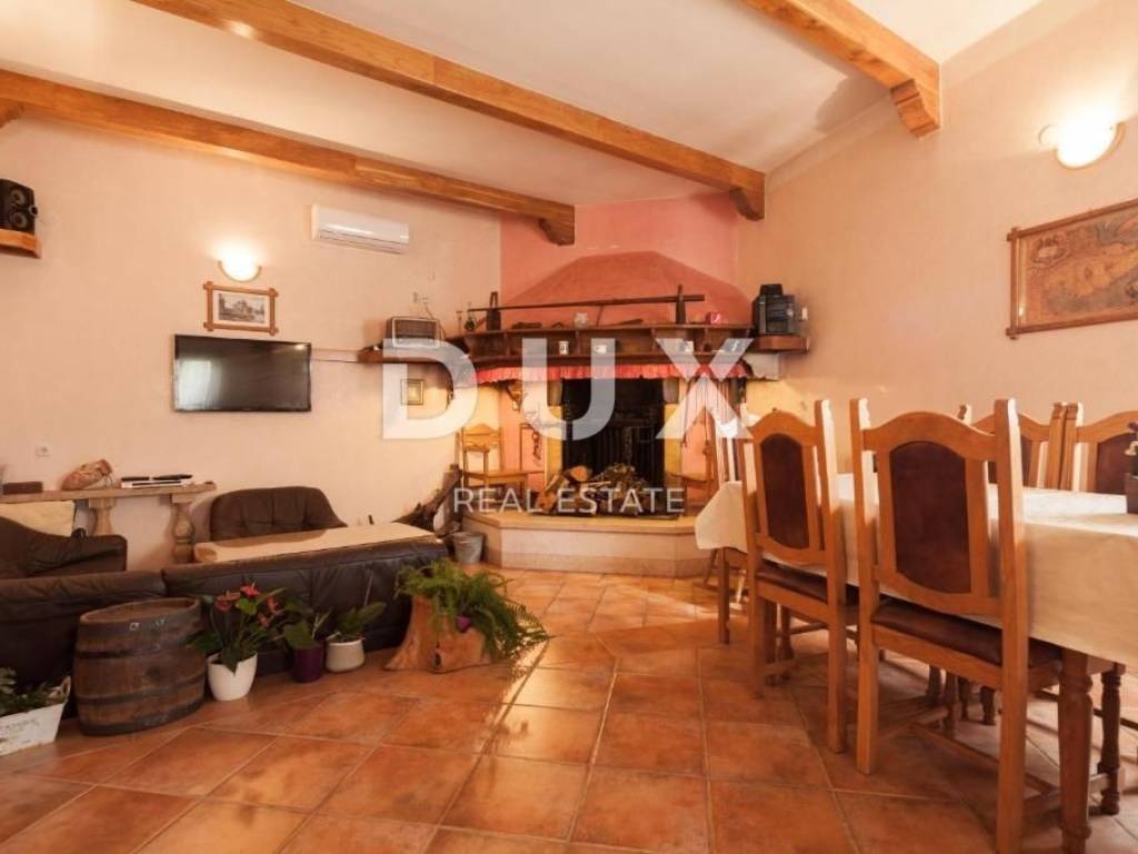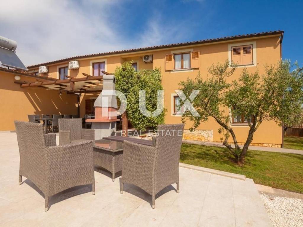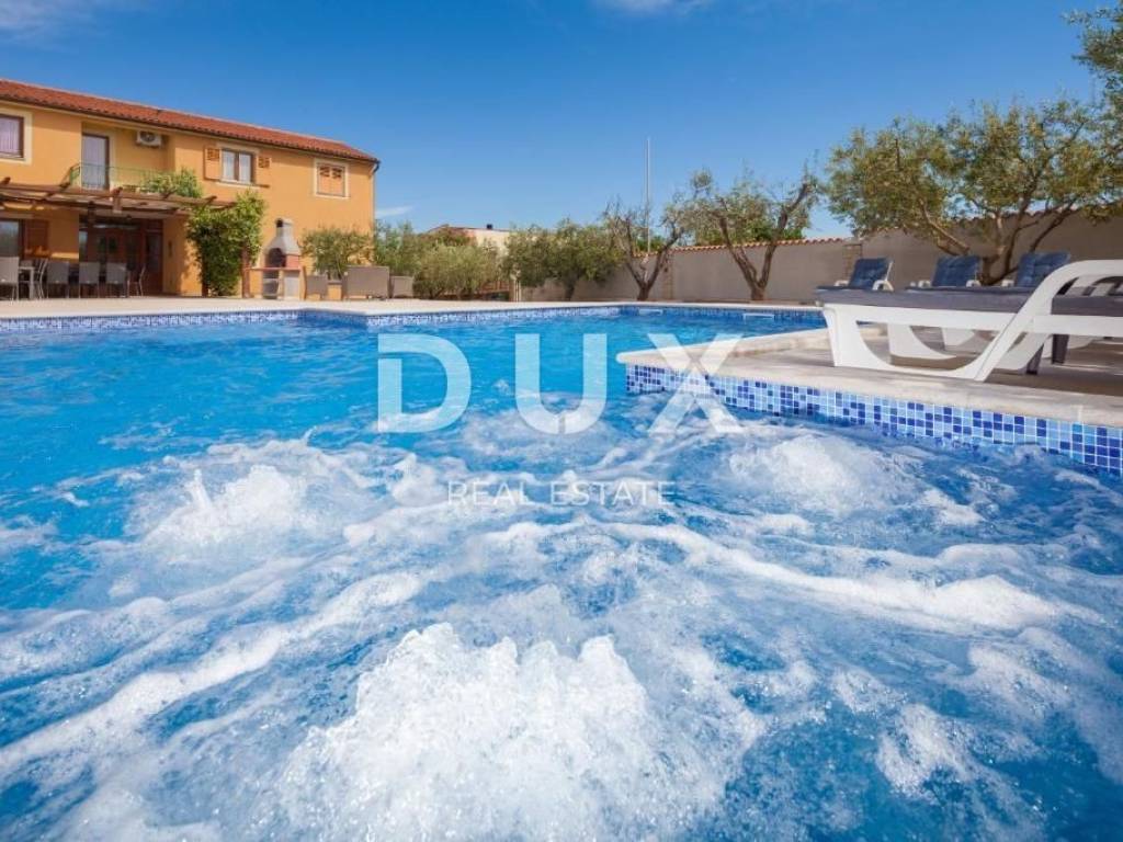 At the southernmost point of the Istrian peninsula, there is a coastal gem - the town of Medulin, one of the most famous representatives of Istrian tourism. It is the center of the popular Medulin Riviera, built on the remains of prehistoric settlements, which includes the surrounding very attractive places; Premantura, Pješčana Uvala, Pomer, Vinkuran, Vintijan, Valbonaša and Banjole. This area also boasts the Medulin archipelago with 11 uninhabited islands and islets. In the village of Banjole, we are selling a house of 500m2 built on a plot of 1381m2, distributed on the ground floor and first floor. It is a house with 9 bedrooms and 7 bathrooms, a large garden with a swimming pool and an additional unfurnished space of 250m2 which is connected to the house and which the future owner can arrange according to his wishes. On the ground floor there is a living room with a fireplace reminiscent of a tavern, a kitchen, a laundry room, a toilet and a storage room connected to a garage for 3 cars. An internal staircase leads to the first floor, where there is an apartment with three bedrooms and a bathroom. One bedroom can be converted into a living room with a kitchen. On the first floor of the house, completely separate from the previously described apartment, there are two more apartments. One apartment consists of a living room with a kitchen and a dining room, one bedroom, a bathroom and a terrace, and the second apartment consists of a kitchen with a dining room, a toilet, a bathroom, three bedrooms (one of which can be a living room) and a terrace. . All rooms are air-conditioned, and there is central gas heating (own gas tank). Solar panels for water heating (300L tank) were installed. The fireplace on the ground floor of the house is connected to the central heating, so that the entire ground floor and the first floor apartment can be heated through a wood-burning fireplace. There is also the possibility of buying an additional building plot of 968m2, located next to the house. If the new owners want to take the property as an investment and rent it out for tourist purposes, the location, swimming pool, accommodation capacity and private parking are certainly a bonus that will greatly facilitate this and ensure a return on investment, and last season the property achieved excellent results.