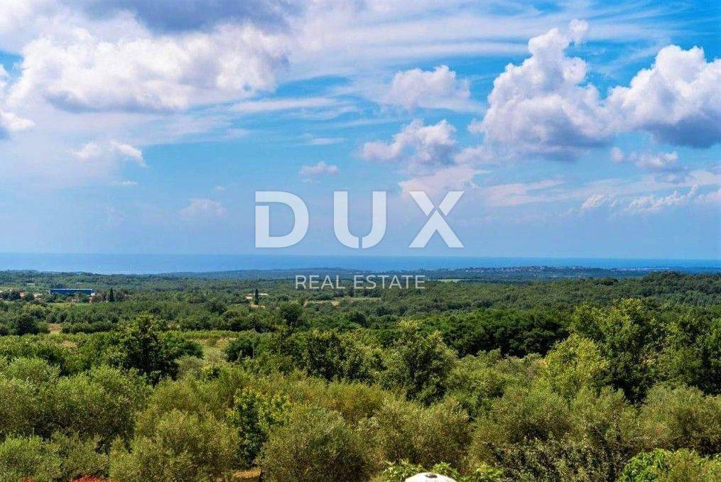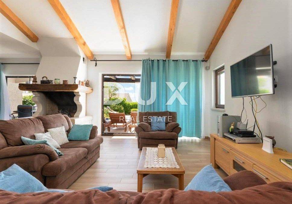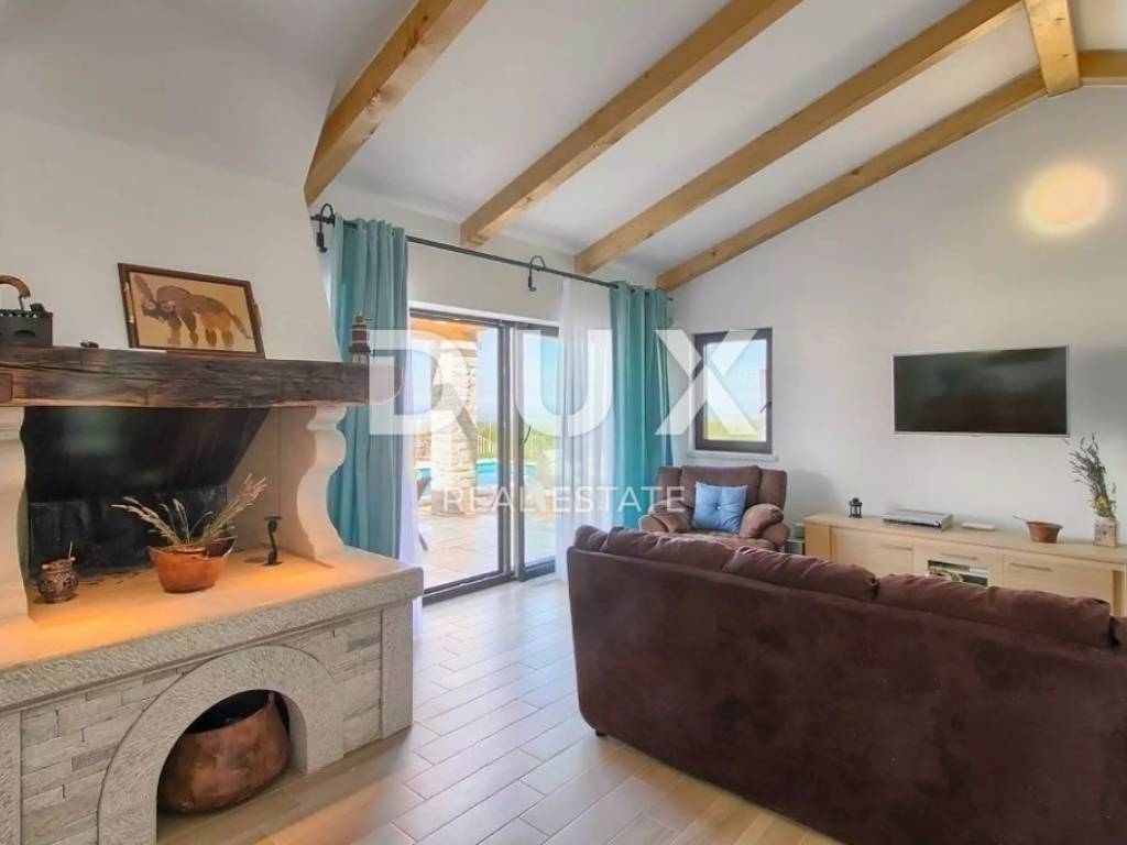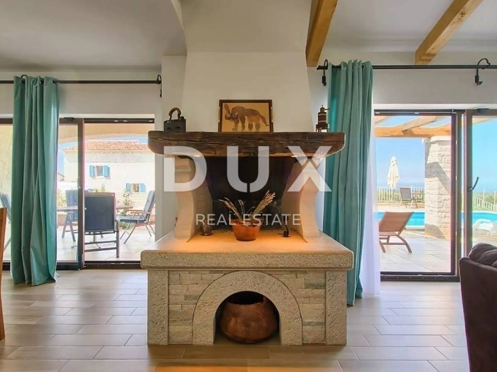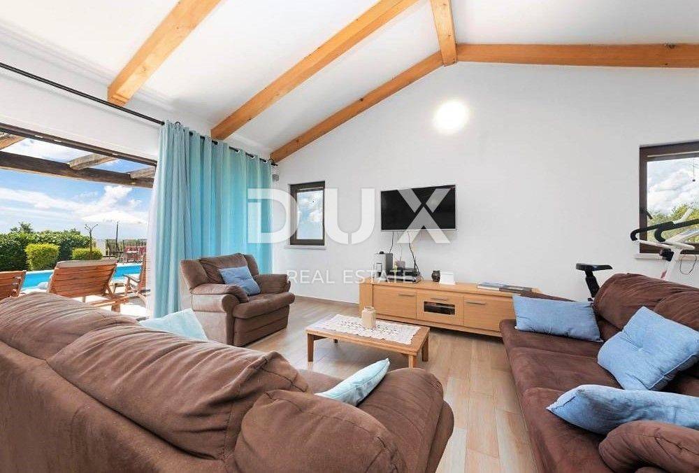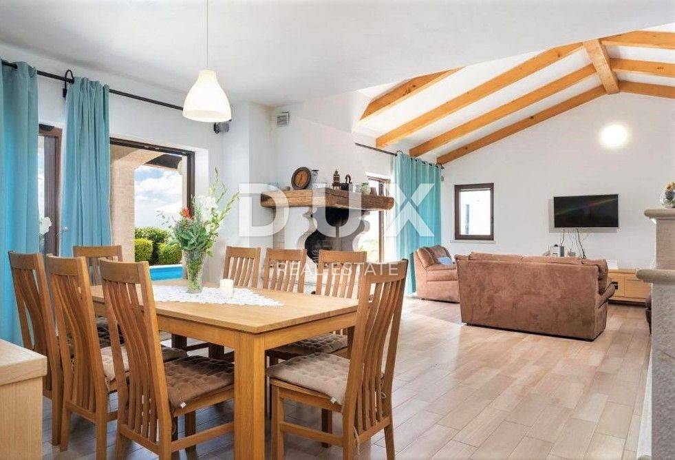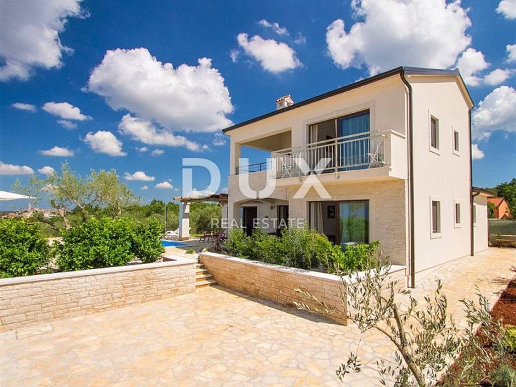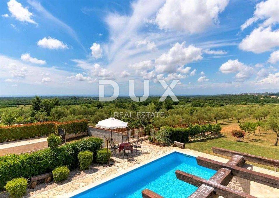 In a fairytale landscape in the hinterland of Višnjan, on the edge of the village, a villa with a panoramic view is for sale. The interior of the villa exudes comfort and airiness with an abundance of natural light and warmth evoked by the wooden beams on the high ceilings. The area of the villa of 155 m is distributed over the ground floor and first floor. On the ground floor there is a living room with a dining room and a kitchen with access to a covered terrace, a bedroom with its own bathroom, an entrance hall, a guest toilet and a laundry room, as well as a storage room with a separate entrance. Upstairs there are two spacious bedrooms, each with its own bathroom and terrace. Both terraces have a panoramic view of the sea and the surrounding area. Heating/cooling of the villa is provided by air conditioners and a solid fuel fireplace in the living area, while water heating is provided by solar panels (two panels and installation for two more). Next to the villa is a swimming pool of 36 m with a sun deck, which also offers a panoramic view of the green interior and the picturesque town of Višnjan, which will not be obscured by the olive groves and agricultural land surrounding the villa on the northwest side. The property is fully equipped and furnished and is being sold as such. This comfortable villa in an attractive location is an ideal opportunity for family life or as an investment for rental for tourist purposes (the object is categorized with 4 stars).
