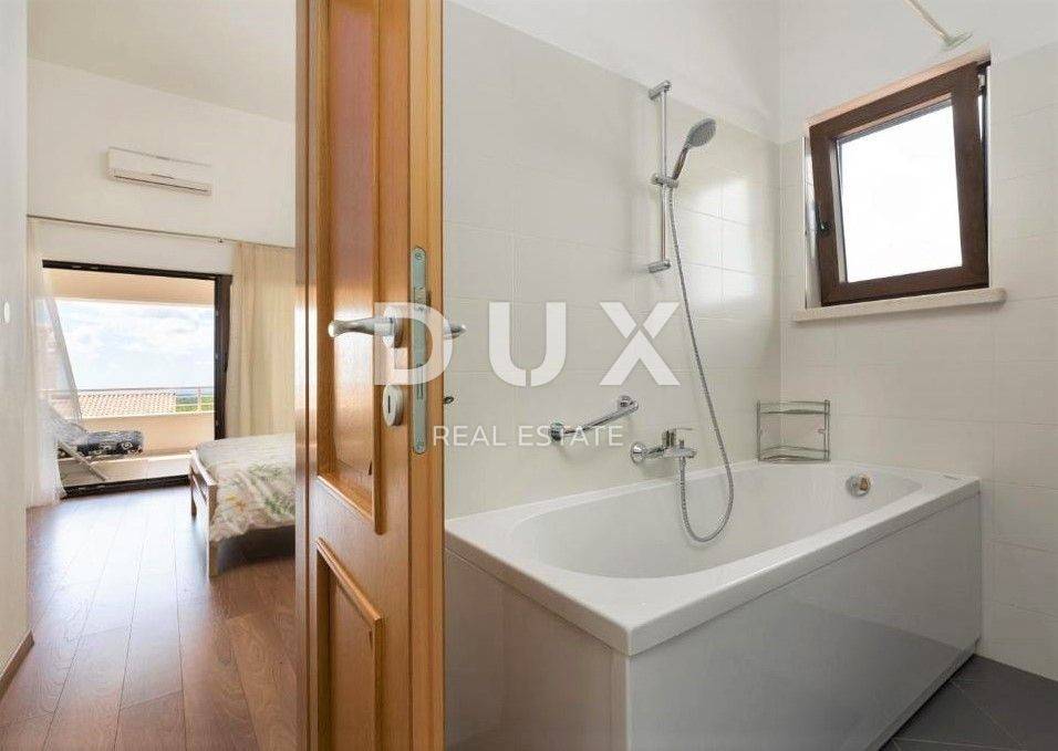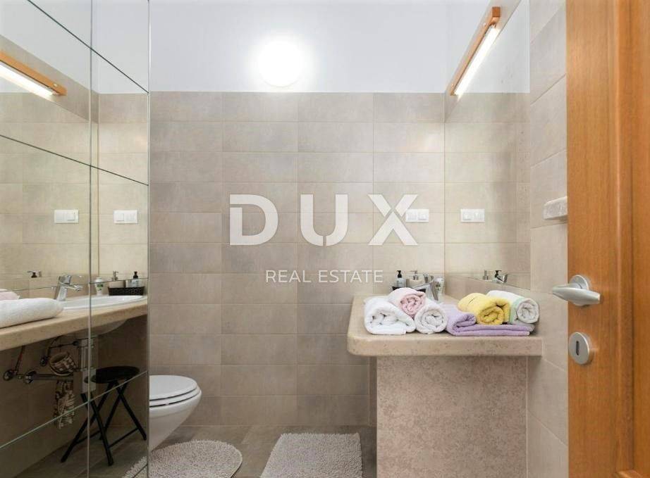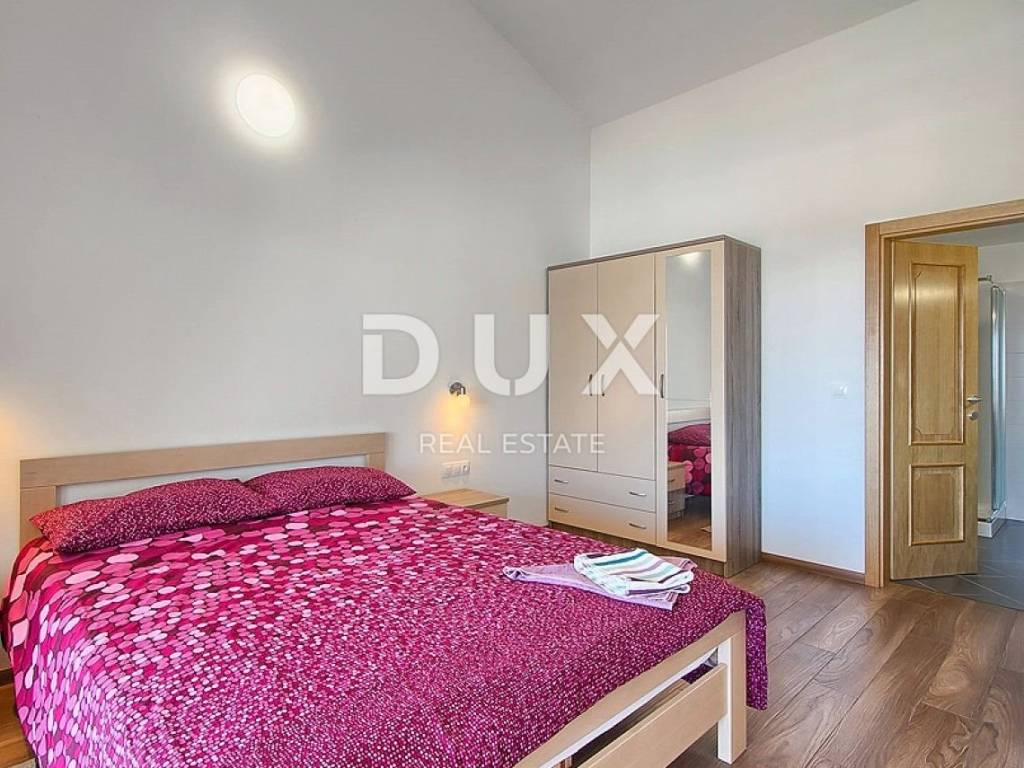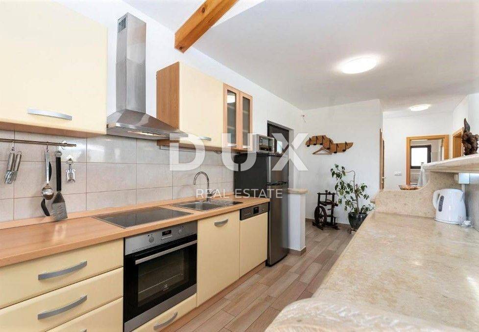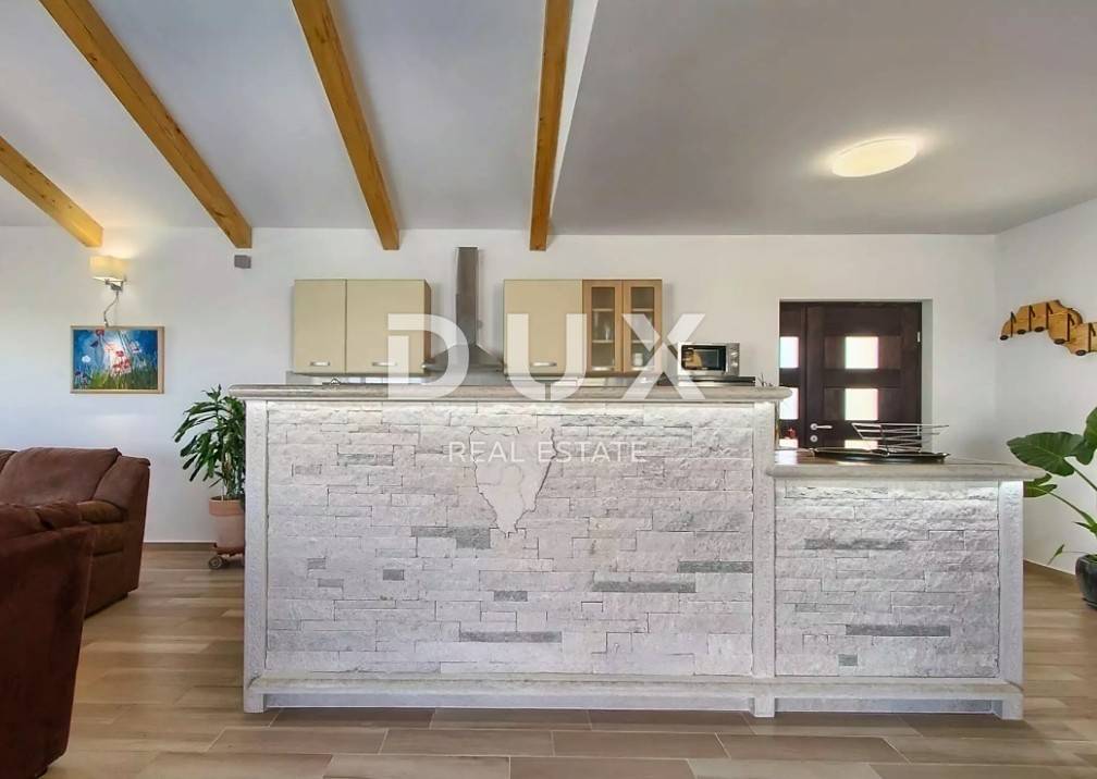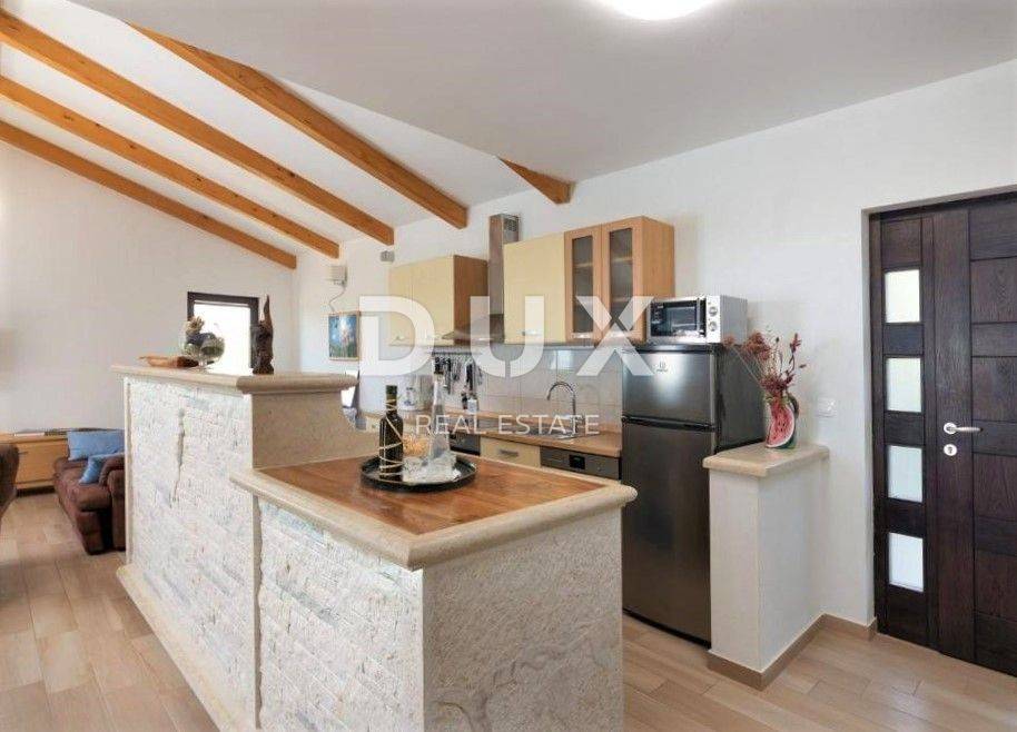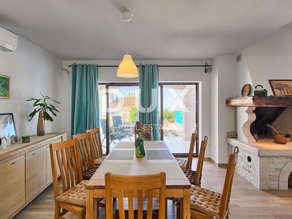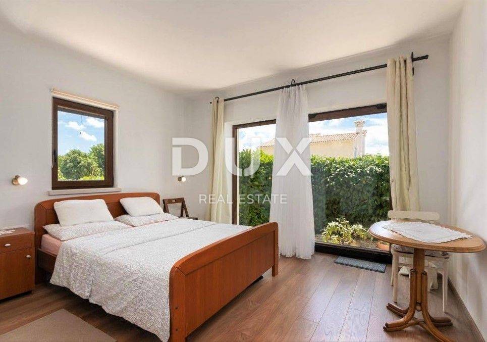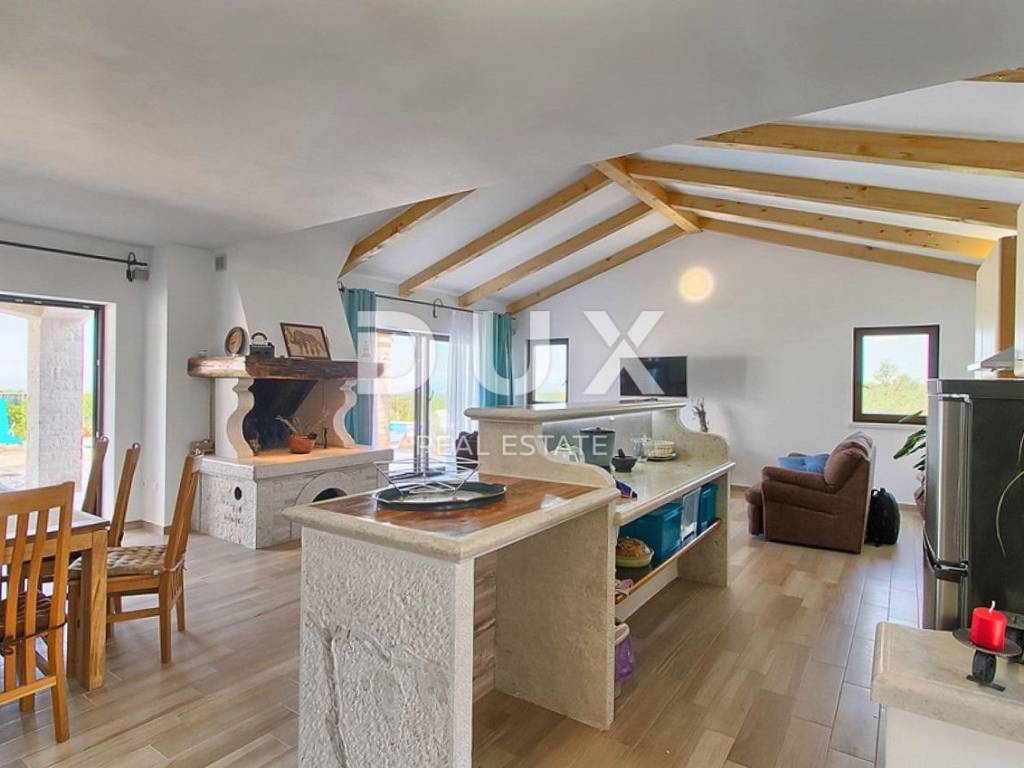 In a fairytale landscape in the hinterland of Višnjan, on the edge of the village, a villa with a panoramic view is for sale. The interior of the villa exudes comfort and airiness with an abundance of natural light and warmth evoked by the wooden beams on the high ceilings. The area of the villa of 155 m is distributed over the ground floor and first floor. On the ground floor there is a living room with a dining room and a kitchen with access to a covered terrace, a bedroom with its own bathroom, an entrance hall, a guest toilet and a laundry room, as well as a storage room with a separate entrance. Upstairs there are two spacious bedrooms, each with its own bathroom and terrace. Both terraces have a panoramic view of the sea and the surrounding area. Heating/cooling of the villa is provided by air conditioners and a solid fuel fireplace in the living area, while water heating is provided by solar panels (two panels and installation for two more). Next to the villa is a swimming pool of 36 m with a sun deck, which also offers a panoramic view of the green interior and the picturesque town of Višnjan, which will not be obscured by the olive groves and agricultural land surrounding the villa on the northwest side. The property is fully equipped and furnished and is being sold as such. This comfortable villa in an attractive location is an ideal opportunity for family life or as an investment for rental for tourist purposes (the object is categorized with 4 stars).