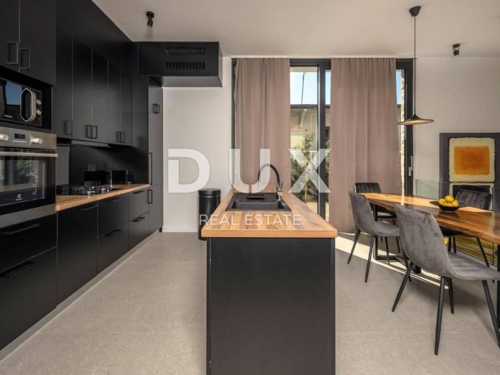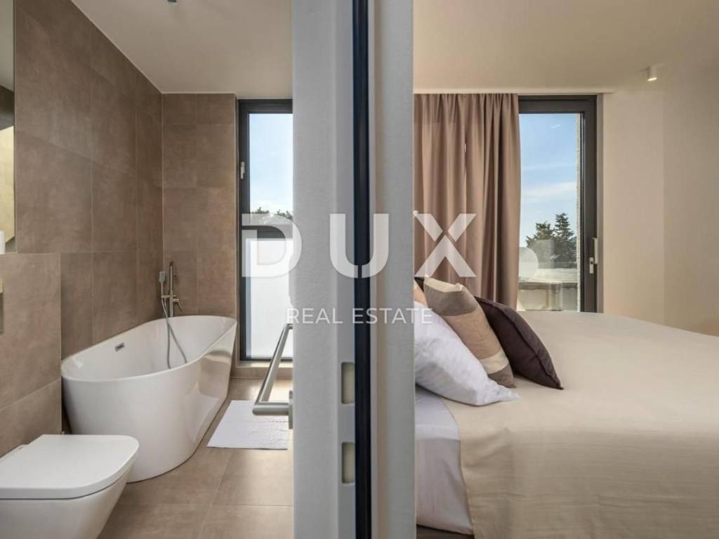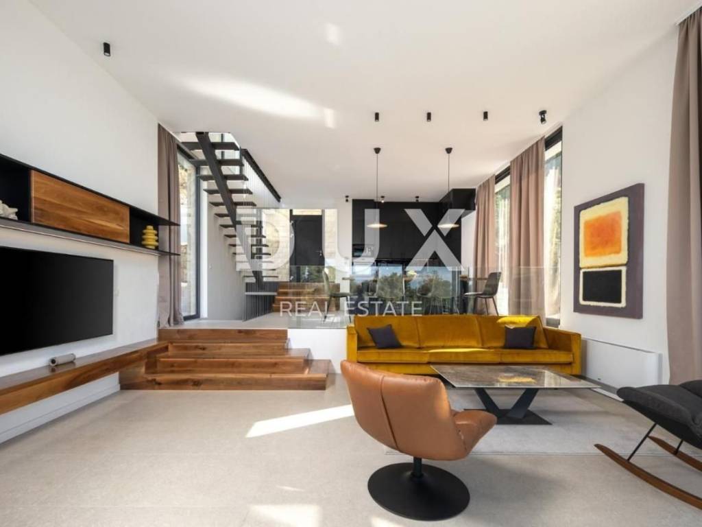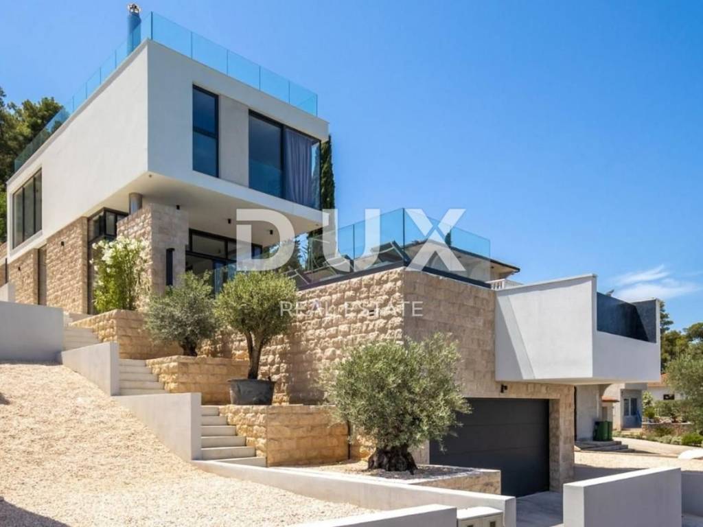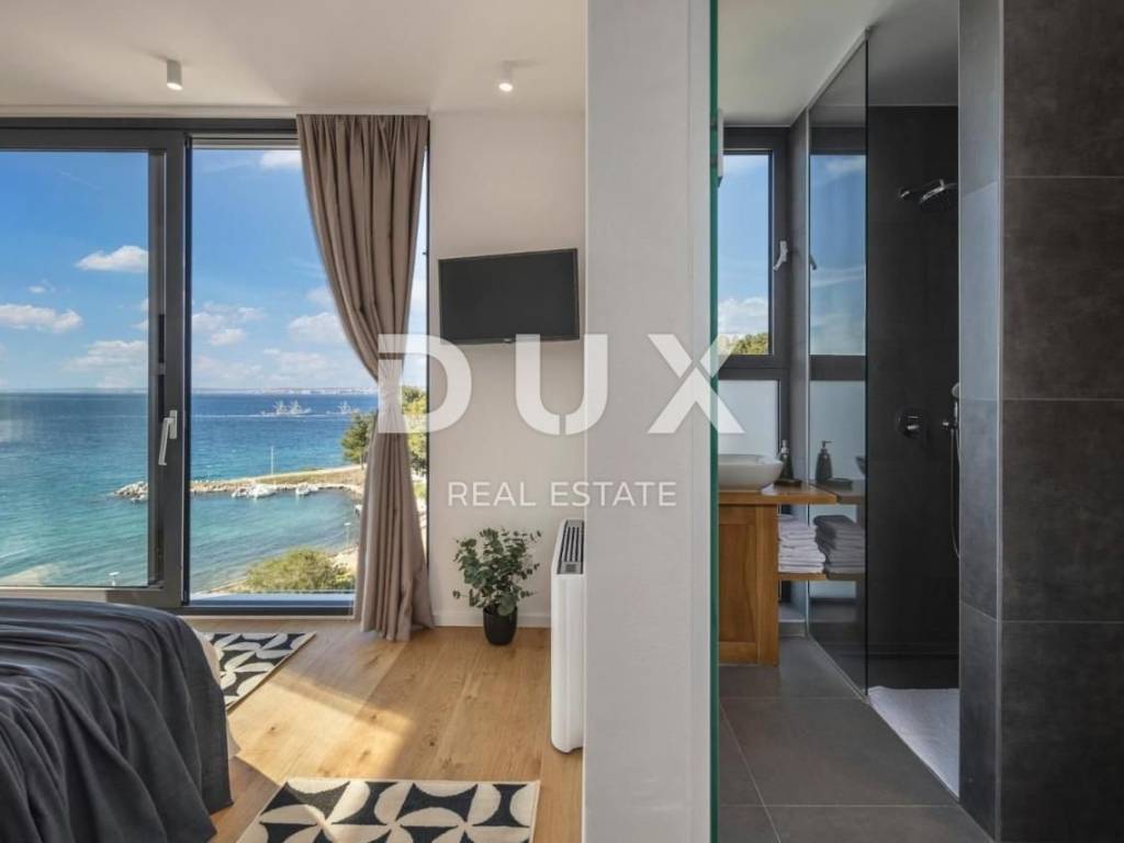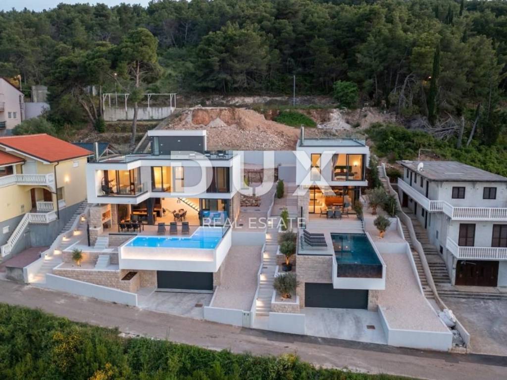 Luxury villa for sale in the town of Kali on the island of Ugljan near Zadar in Northern Dalmatia. The villa has a total living area of 260 m2 on a plot of 445 m2. It is located first row to the sea, and is only twenty meters from the beach. The villa is architecturally conceived in a cascade, and in harmony with the surrounding space, so the stone facade is harmoniously integrated into the modern interior and exterior design. On the ground floor of the villa there is a fully equipped kitchen, dining room and living room designed as an open space. The glass wall in the living room allows plenty of light throughout the day, and there is also a beautiful infinity pool on the terrace. From the terrace, as well as from all the rooms in the villa, there is a stunning view of the nearby islands and the sunset. On the ground floor of the villa there is also an additional toilet and a laundry room. On the first floor of the villa there are three air-conditioned bedrooms with attached bathrooms.