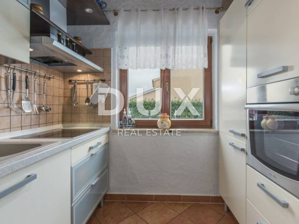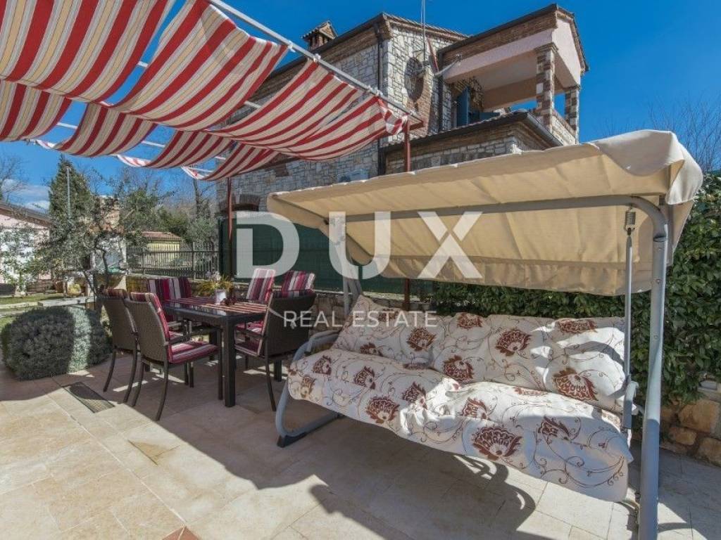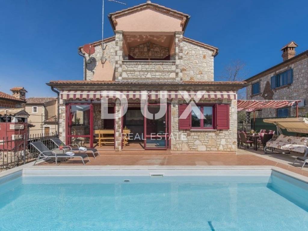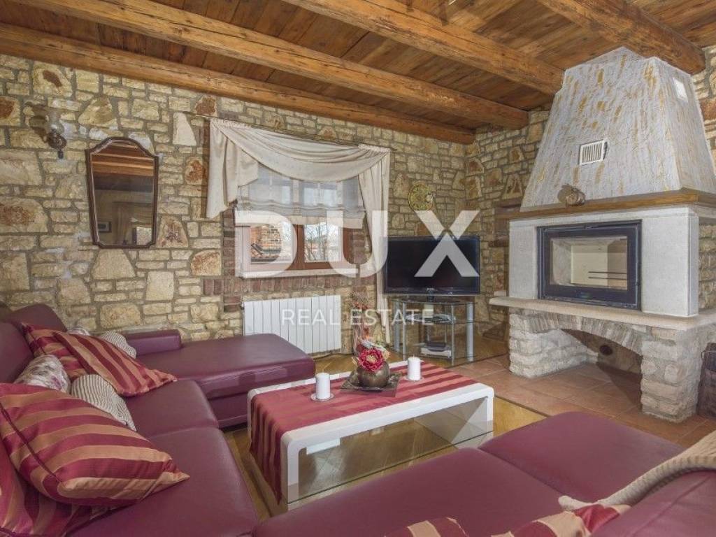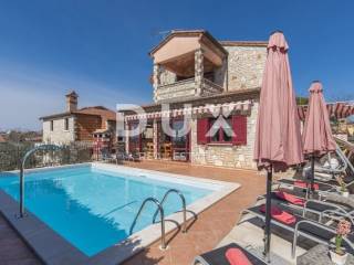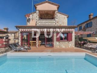 In the vicinity of Kastelir there is this beautiful villa of rustic-Istrian style, which consists of a basement apartment of approximately 40 m2 in which there is a kitchen with dining room, bathroom and one bedroom. In the main part of the house you enter through a hallway leading straight to a small bathroom, left to the stairs to the upper floor and right to a large living room with fireplace and dining area with large table and chairs, while a beautiful kitchen has access to a closed terrace. In front of the terrace there is a large pool with deck chairs and a fireplace for barbecue. The ceiling of the ground floor is decorated with wooden beams, and the walls are lined with Istrian stone. The facade of the villa is additionally decorated with red aluminum shutters, while the wooden stems are natural. Upstairs there are three bedrooms, two larger bedrooms and one children's smaller room and a large bathroom. Each room has a TV connection and internet. Through the hallway you exit to the balcony which offers its guests a beautiful view of the sea and the whole village where they can enjoy a morning coffee. Within the house there is another apartment of approximately 40 m2 which has central heating and consists of a kitchen with dining area, one bedroom and a small bathroom. The villa has a boiler room with an oil central heating stove, a laundry room and one large garage. In the evening, the lights on the remote control are turned on, which further enhances the villa in its style. An exceptional opportunity with a beautiful view for future owners.