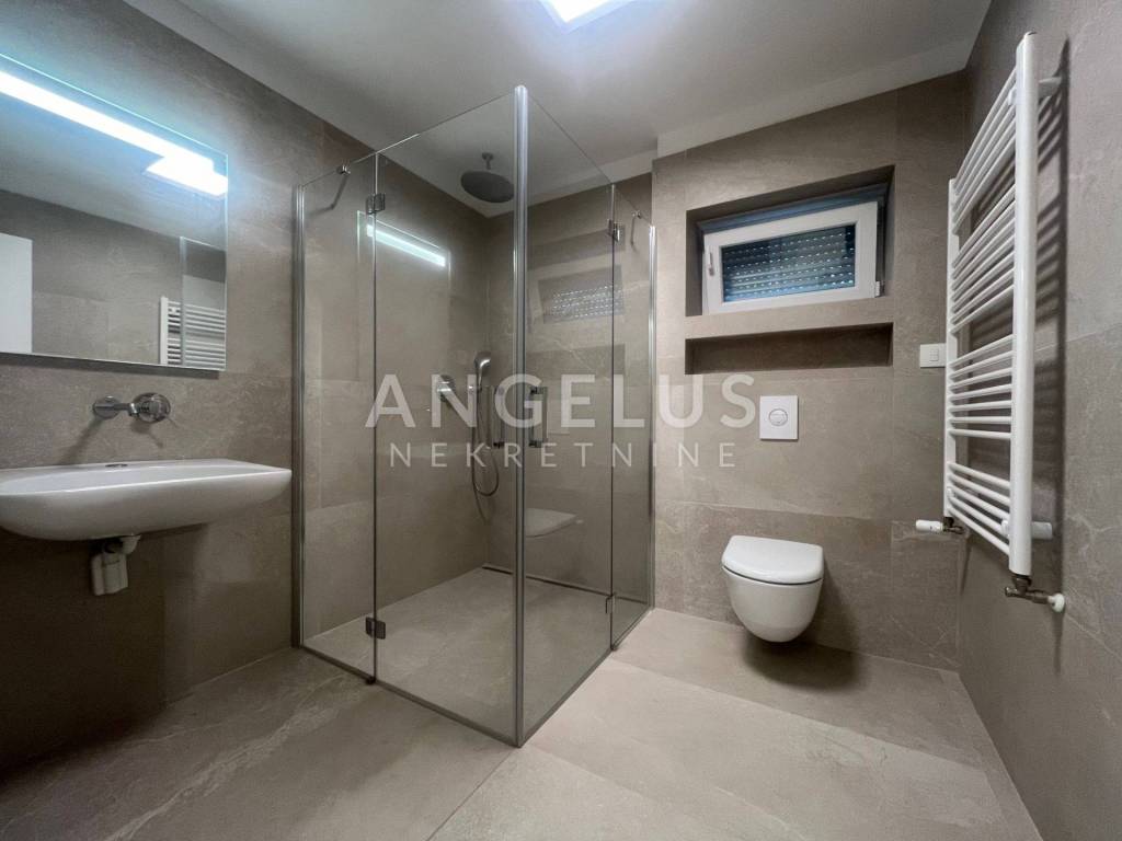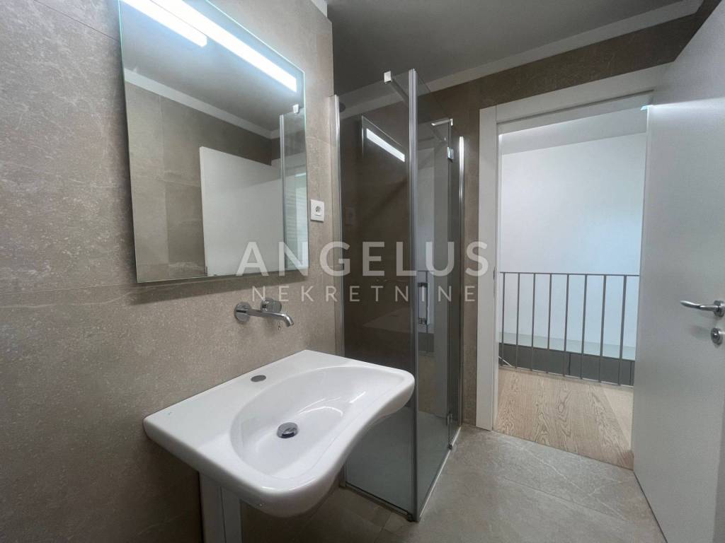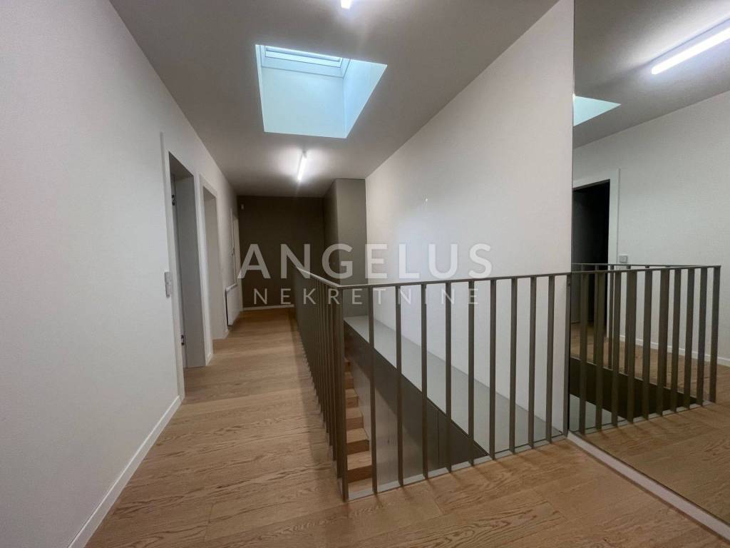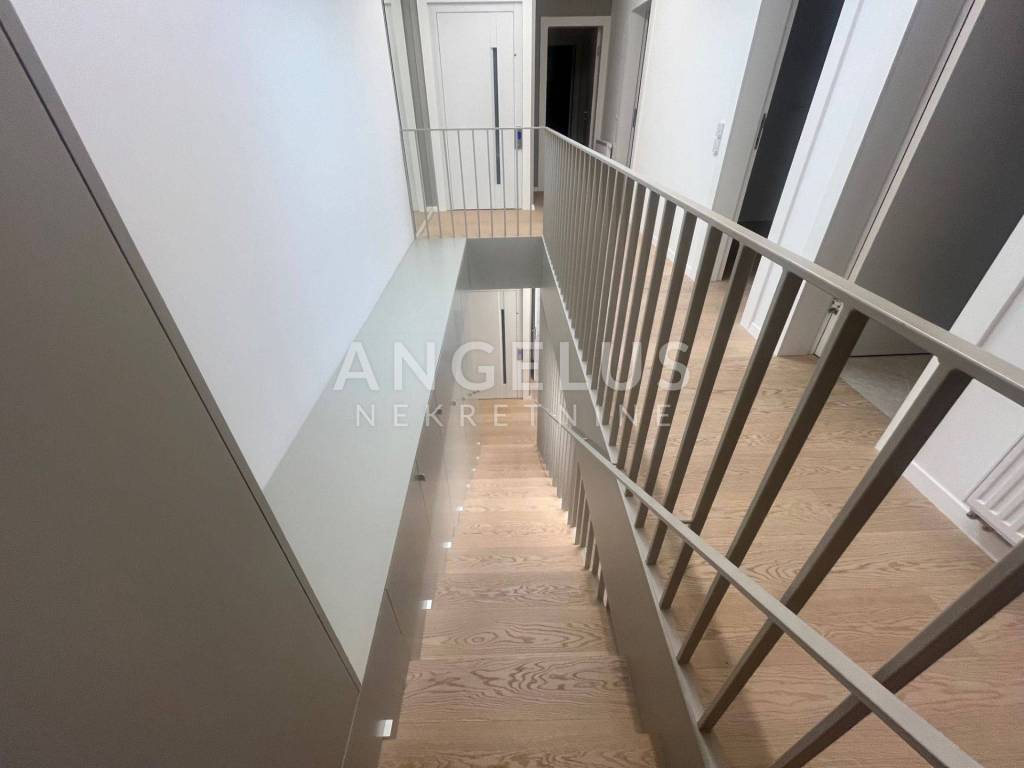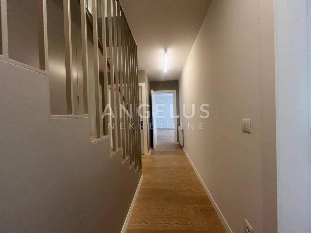 It is situated on the ground floor and first floor of the newer, high-quality building. The first floor consists of: entrance hall, bedroom, bathroom, kitchen connected to the living room and dining room and access to the terrace and shared garden, and the second of: 3 bedrooms, cloakroom and two bathrooms. It is air-conditioned, gas central heating, direct elevator access to the apartment through both levels. It is unfurnished (except the kitchen and built-in wardrobes), furniture upon arrangement. It has storage and 2 parking spaces in the garage with chargers for electric vehicles, and if necessary, it is possible to rent a third one.