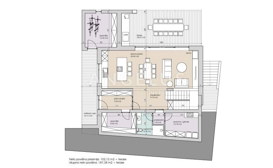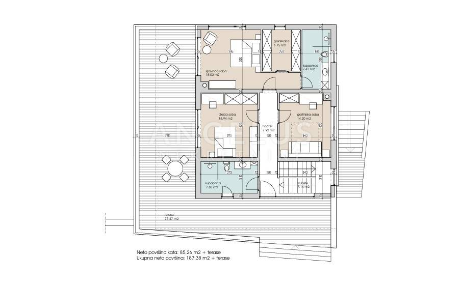 According to the project, the villa extends over two floors (see floor plans), on the ground floor there is a spacious living room with kitchen and dining area, bathroom, two spacious storage rooms, laundry room and terrace with barbecue, while on the first floor there are three bedrooms with two bathrooms and a spacious terrace of 70 m2.