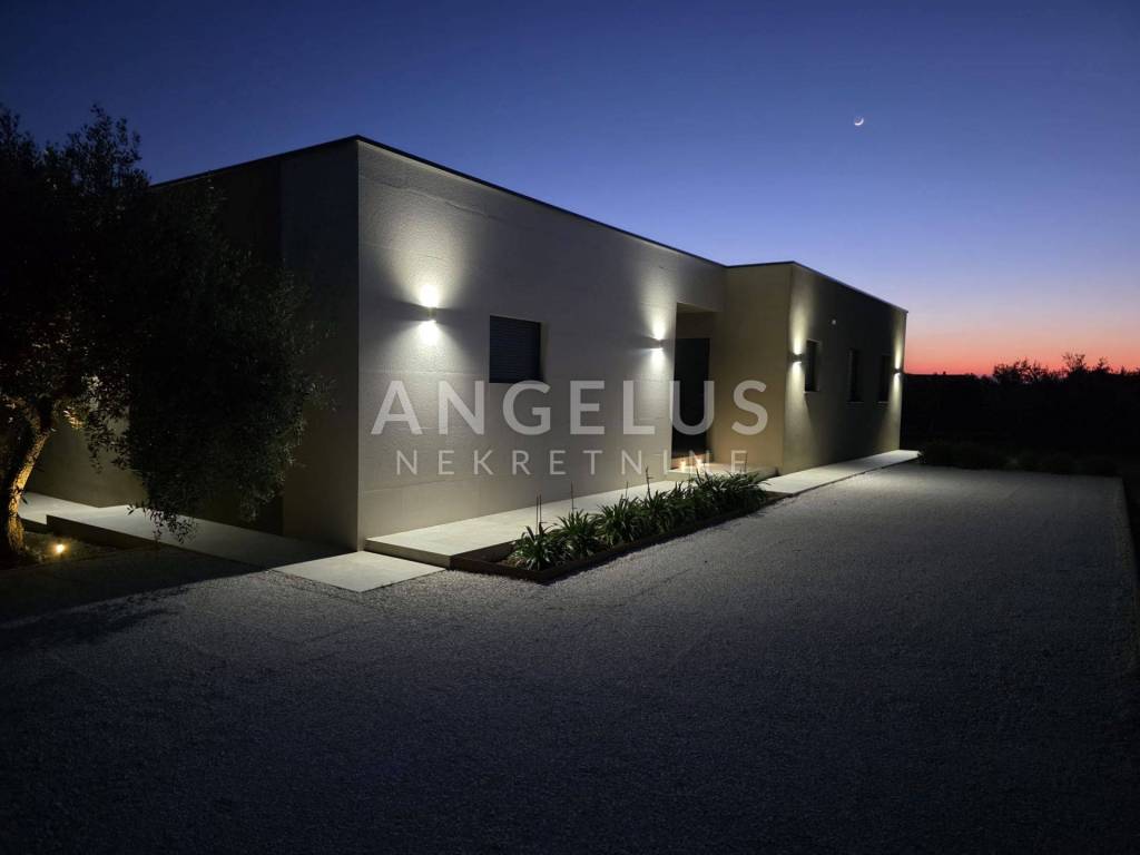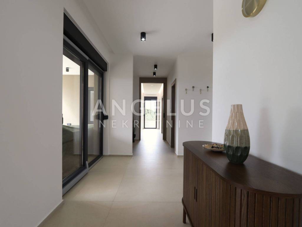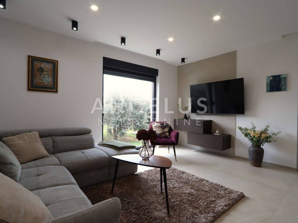 This is a beautiful newly built modern single-family house consisting of a spacious living room, dining room and kitchen in an open-plan concept. A unique view is offered upon entering the house where there are immediately large glass walls and a view of the terrace, heated pool, olive grove and nature. Down the hall there is a bathroom, two bedrooms, and a large master bedroom with a separate bathroom and walk-in closet.
