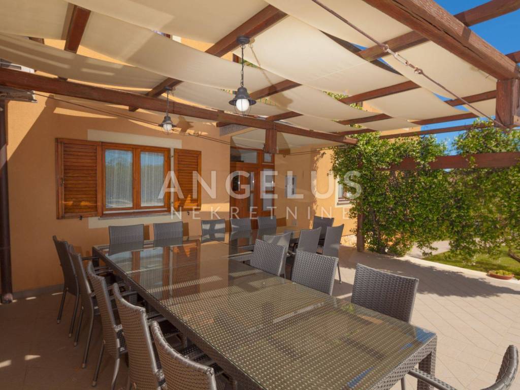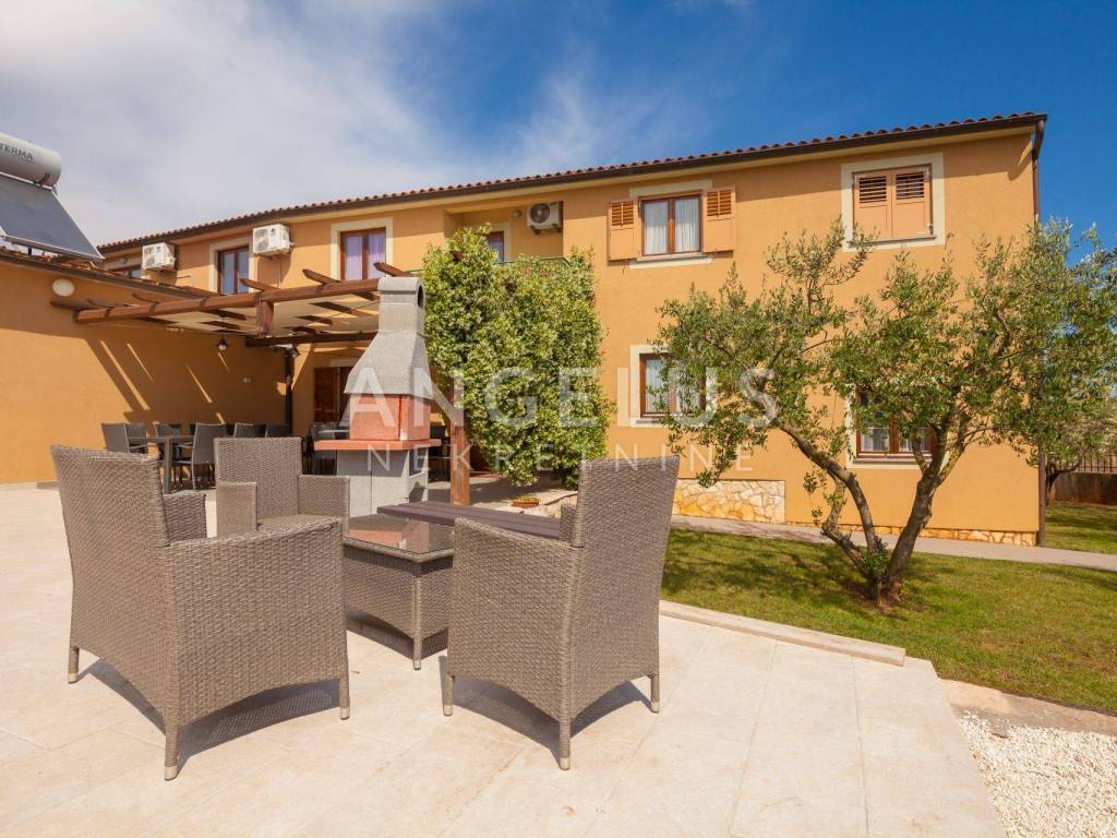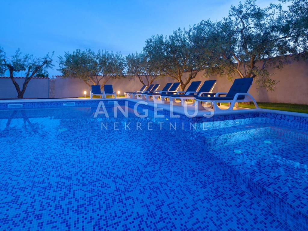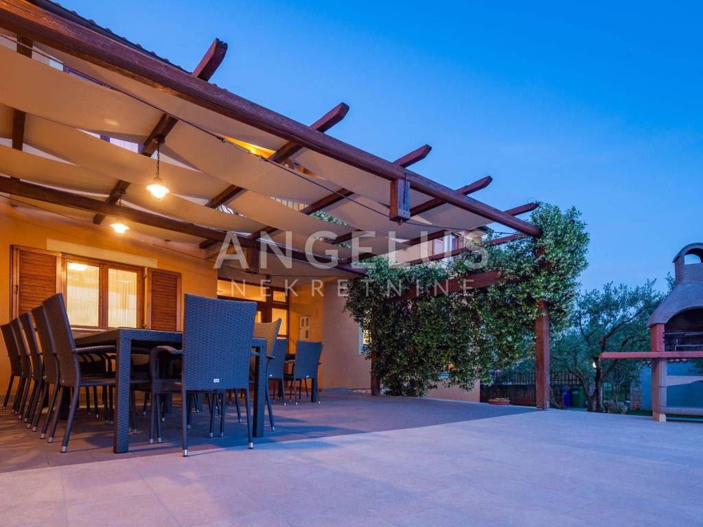 The adjoining yard is 900 m2, has 40 olive trees, the pool is 70 m2 with a shallow area for children and a jacuzzi. The house has central gas heating, gas and electric hot water heating and a solar panel, and in winter the internal fireplace has the possibility of central heating. There are also 9 air conditioners in the house. With regard to the spatial plan, there is the possibility of upgrading the building, the maximum built-up area according to the spatial plan is 50%, while the current built-up area is somewhere around 37. The building has two floors in the residential part and one floor in the part of the auxiliary building, and it is possible to build 3 floors so that there is also additional space that provides potential for various purposes, especially due to the zone in which it is located. The house is located in the business zone, K1, mostly commercial. Literally everything can be done, business premises, shop, store, restaurants and everything related to tourism.