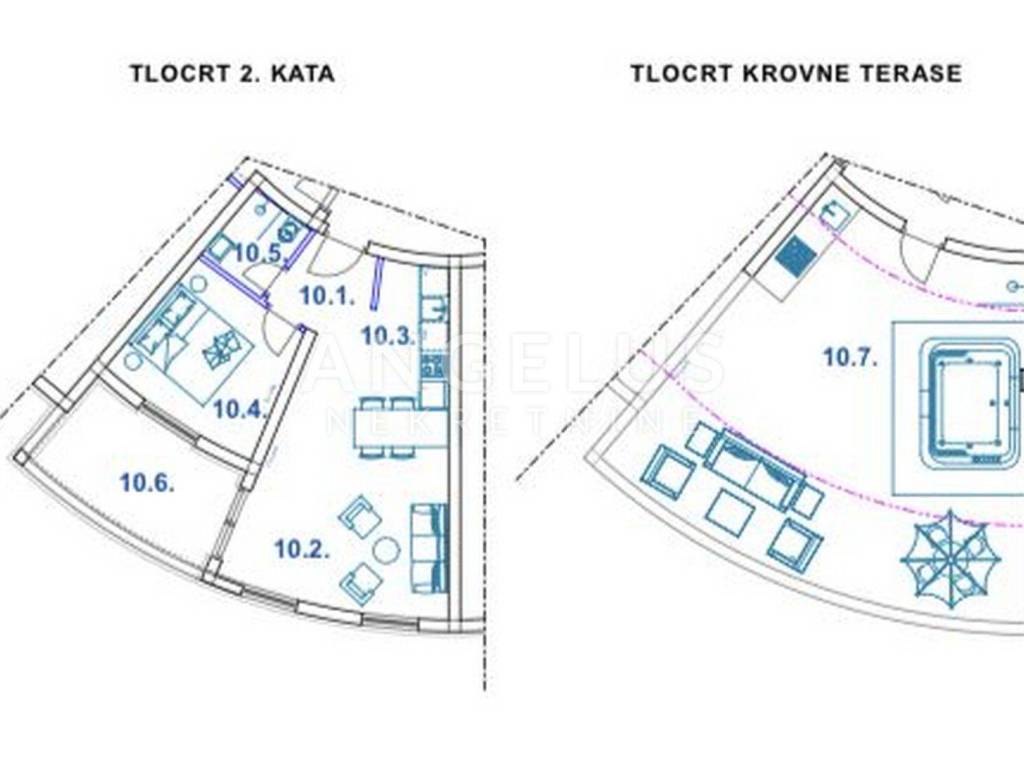 A one-room apartment with a total net usable area of 61.64 m2 is for sale in a new building, located on the second floor of a modern building with a total of twelve apartments. The apartment consists of a hallway, kitchen and dining room with living room, bedroom, bathroom, large terrace with an open sea view. The apartment also has a large roof terrace of 51.53 m2 with a completed installation for a summer kitchen and jacuzzi. Two more parking spaces are attached to the apartment, with a net usable area of 12.00 m2 each and a courtyard plateau of 9 m2 that can be converted into an outdoor storage room.