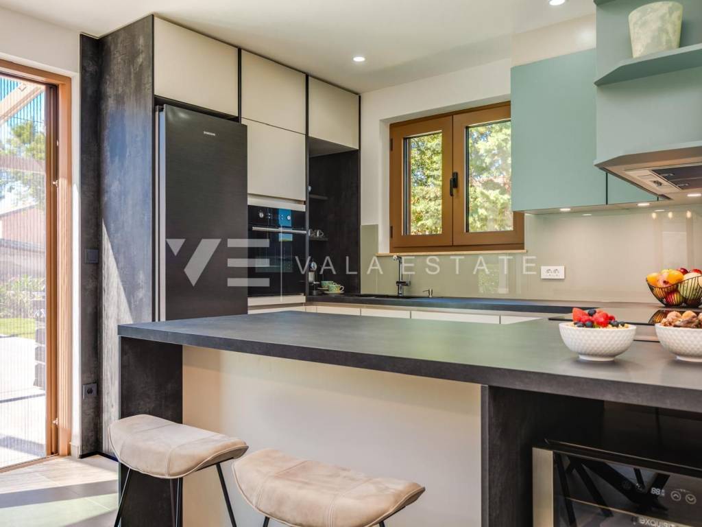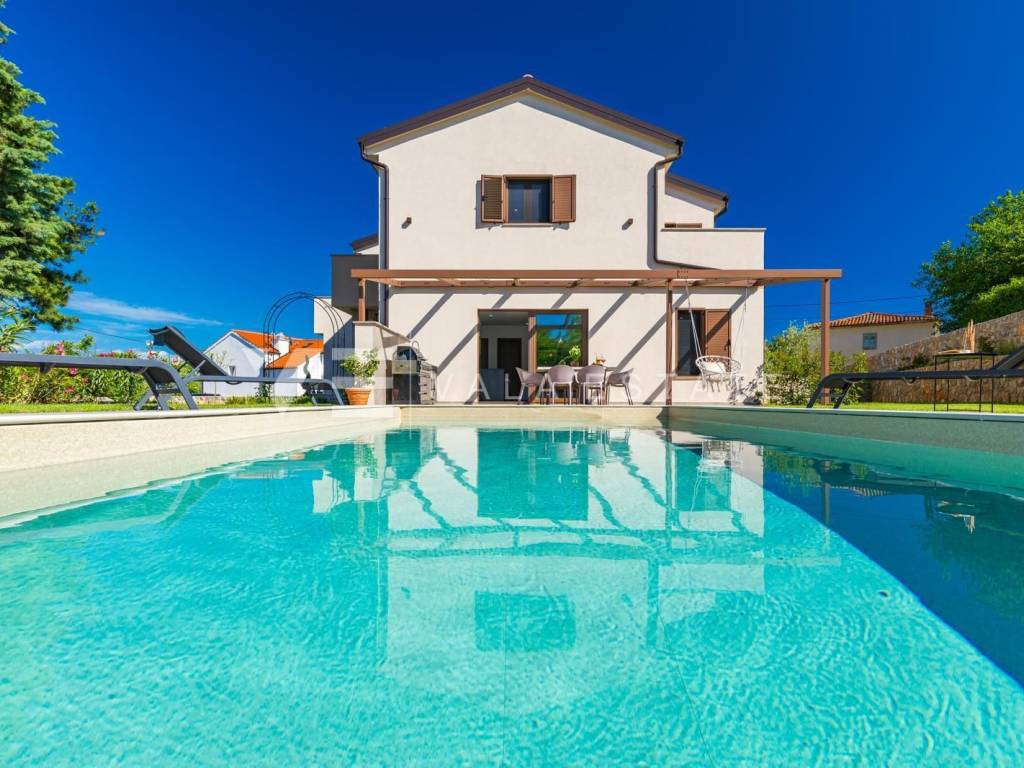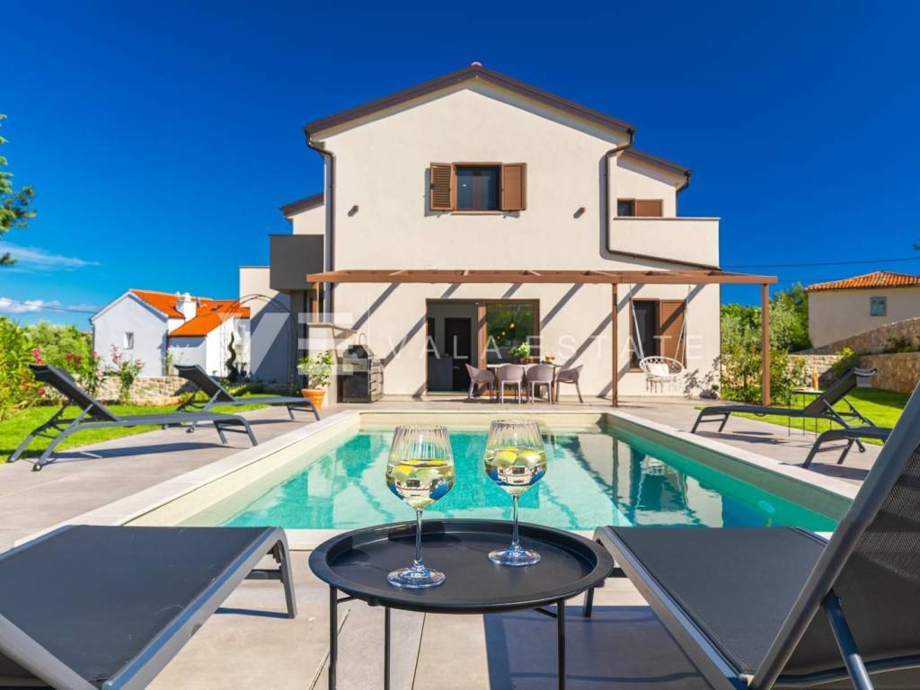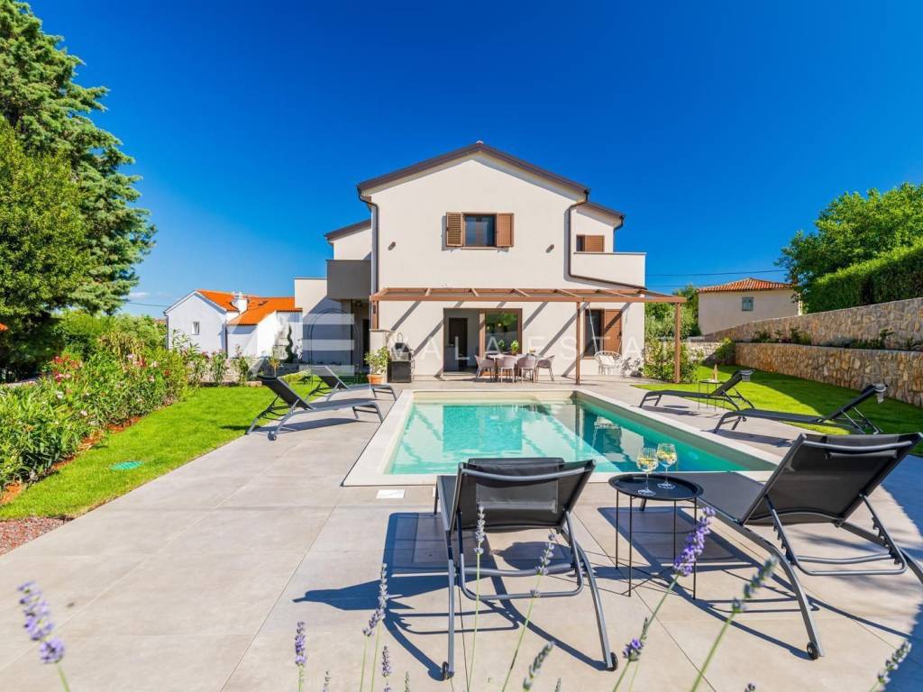 Real estate on the island of Krk, the town of Krk and its surroundings - in a quiet location near the town of Krk, a new modern semi-detached house is for sale, which occupies 140 m2 of living space and is arranged over the ground floor and first floor. The ground floor has an entrance hall, a storage room with a washer and dryer, a toilet, a bedroom with its own bathroom and a living room with a kitchen and dining area with access to a covered terrace and garden. On the first floor, which is connected by internal stairs, there are two bedrooms with their own bathrooms and access to a large terrace with a beautiful view of nature. On the beautifully landscaped garden with automatic irrigation there is a swimming pool with a sunbathing area, a fully equipped outdoor kitchen with a barbecue and an area for socializing and spending time outdoors. It is fully furnished with new modern furniture and is being sold as such. High-quality materials and equipment were used for construction, including ceramic floor coverings and oak parquet floors, quality sanitary ware, multisplit air conditioning in all rooms, underfloor heating, installed high-quality PVC and ALU three-layer joinery and security doors. It has two parking spaces at the entrance to the yard. This beautiful and high-quality modern new building is located in a quiet location only 3000 m from beautiful beaches and all amenities.