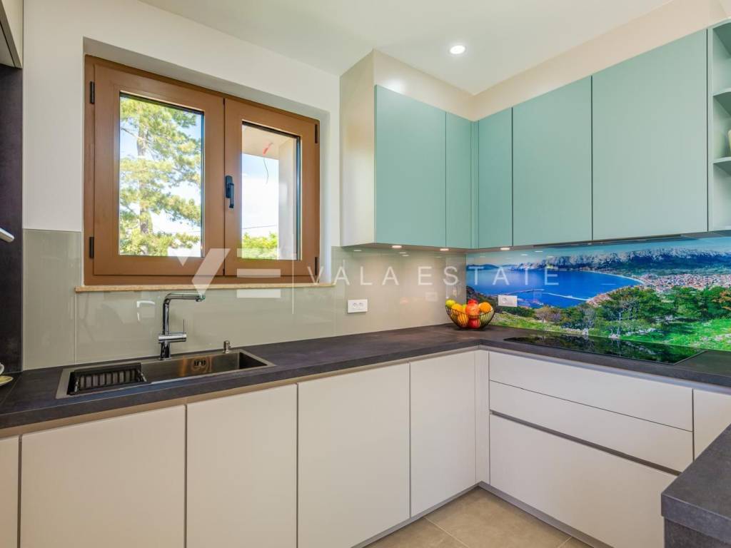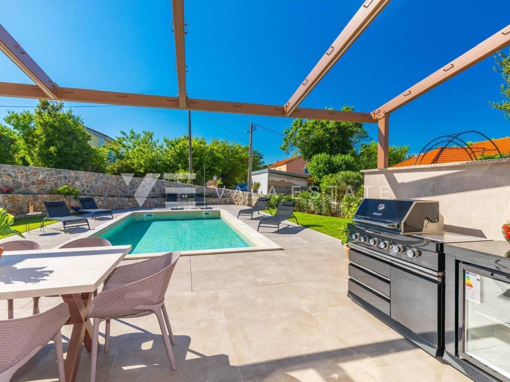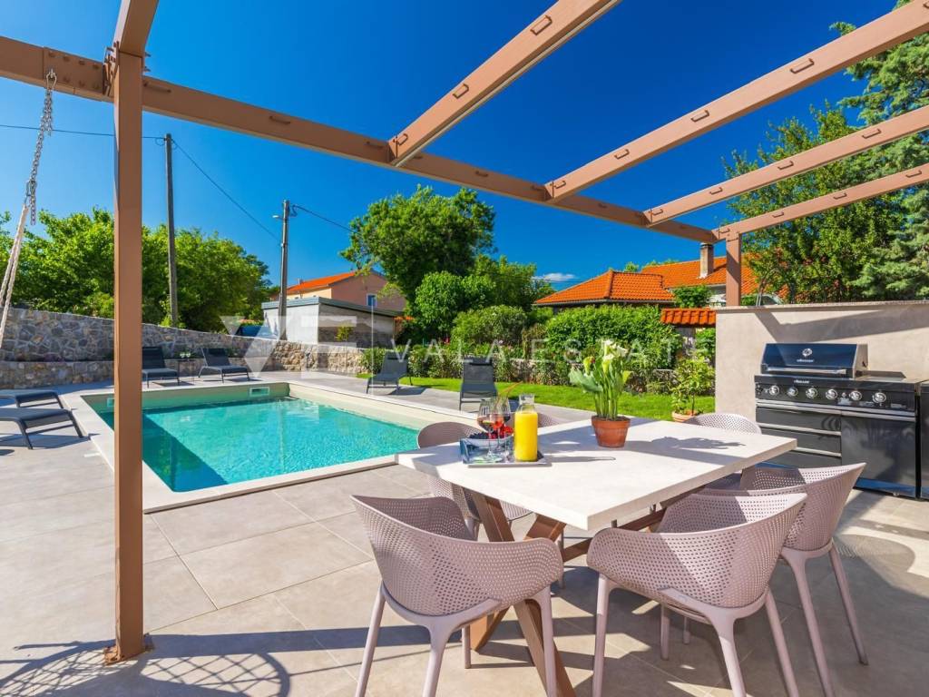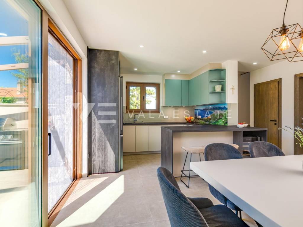 Real estate on the island of Krk, the town of Krk and its surroundings - in a quiet location near the town of Krk, a new modern semi-detached house is for sale, which occupies 140 m2 of living space and is arranged over the ground floor and first floor. The ground floor has an entrance hall, a storage room with a washer and dryer, a toilet, a bedroom with its own bathroom and a living room with a kitchen and dining area with access to a covered terrace and garden. On the first floor, which is connected by internal stairs, there are two bedrooms with their own bathrooms and access to a large terrace with a beautiful view of nature. On the beautifully landscaped garden with automatic irrigation there is a swimming pool with a sunbathing area, a fully equipped outdoor kitchen with a barbecue and an area for socializing and spending time outdoors. It is fully furnished with new modern furniture and is being sold as such. High-quality materials and equipment were used for construction, including ceramic floor coverings and oak parquet floors, quality sanitary ware, multisplit air conditioning in all rooms, underfloor heating, installed high-quality PVC and ALU three-layer joinery and security doors. It has two parking spaces at the entrance to the yard. This beautiful and high-quality modern new building is located in a quiet location only 3000 m from beautiful beaches and all amenities.
