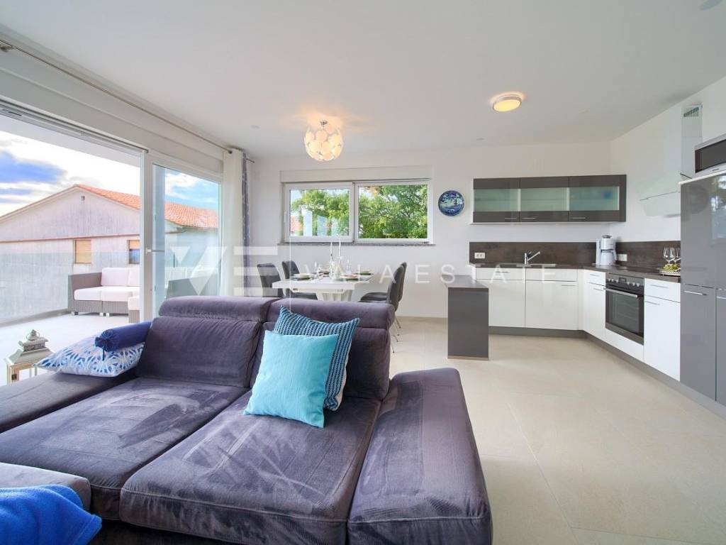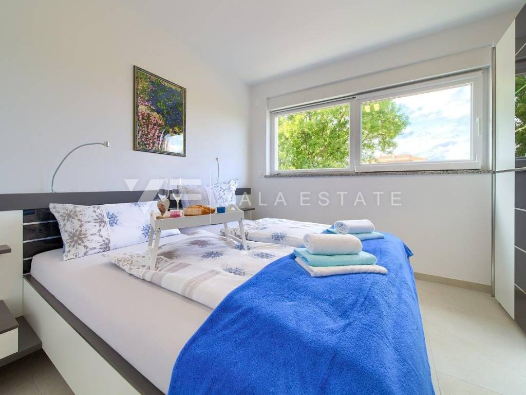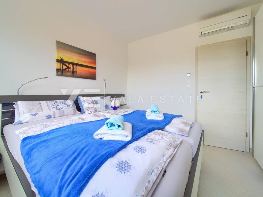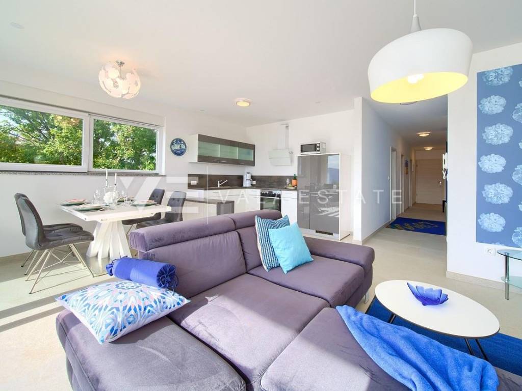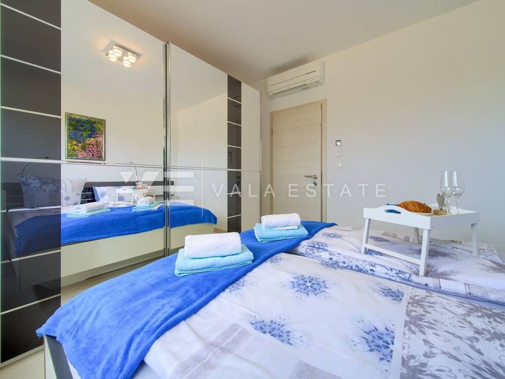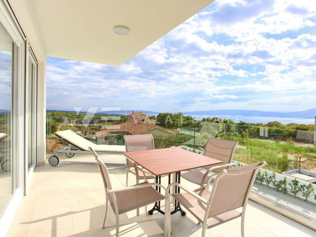 Real estate island of Krk, surroundings of the town of Krk - for sale is an excellent newer apartment located on the first floor of a modern villa with a total living area of 84.39 m2. It consists of an entrance area, two bedrooms, two bathrooms, a kitchen with a dining room and a living room from which there is access to a large covered terrace with a view of the sea. The apartment is fully furnished with modern furniture and quality equipment, it is air-conditioned, has PVC joinery, there are also solar panels for heating water on the roof, which have achieved high savings on overhead costs. It has two parking spaces in the common yard of the house. An excellent opportunity for investment for tourist rental purposes, as well as your own stay and enjoying the panoramic view and beautiful sunsets. Beautiful and quiet location, 1500 m from the sea.