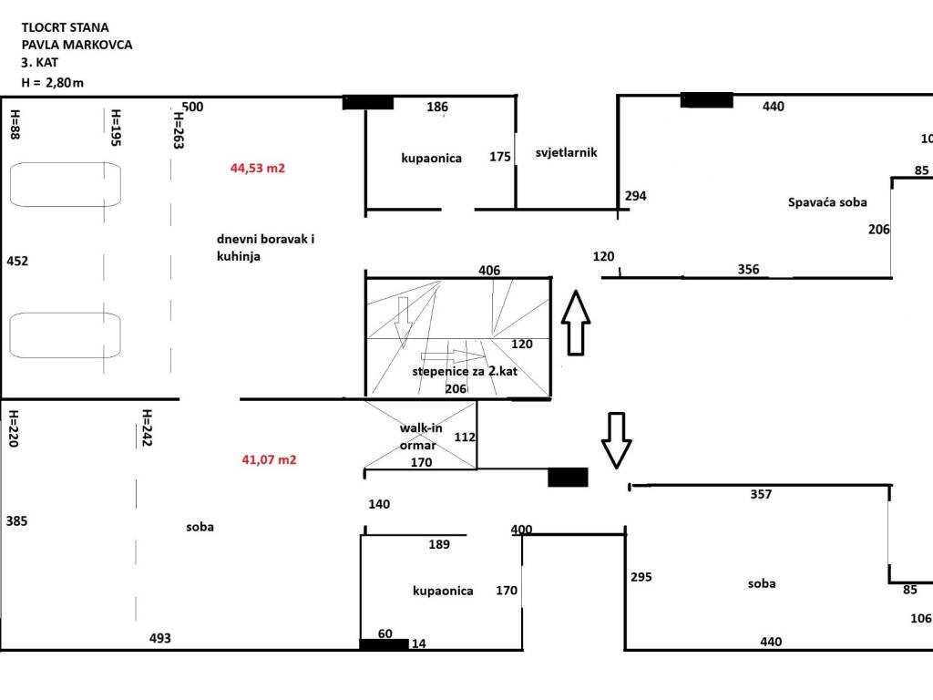 Trenutno 4 sobe, kuhinja sa blagovaonicom, 3 kupaonice, 3 hodnika, walk-in ormar i 3 hodnika