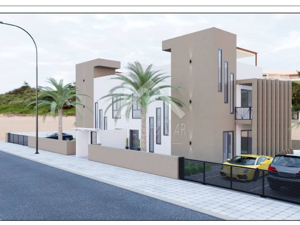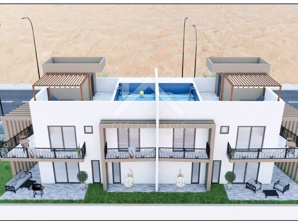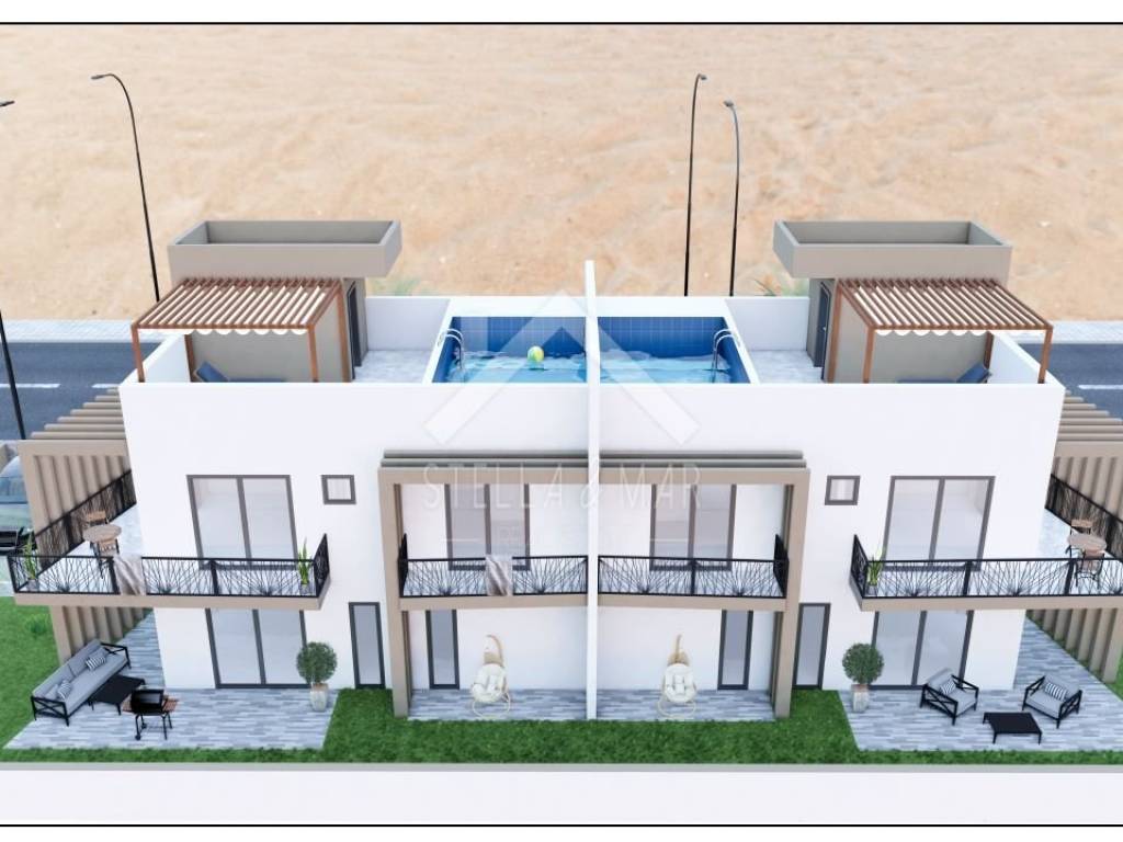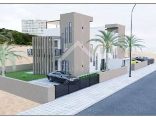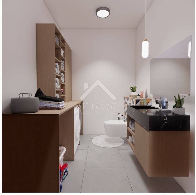 On the ground floor there is a hallway, a living room with a kitchen and dining room, a bathroom and an exit to the outdoor terrace. Internal stairs lead to the first floor of the house, where there are three bedrooms and two bathrooms. Furthermore, stairs lead to the roof terrace where the swimming pool will be located.