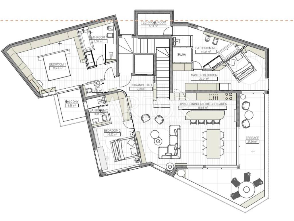 The apartment has a total area of 431 m and is situated on the 3rd floor of a newly constructed building with an elevator that leads directly from the garage into the living room. It consists of a spacious living area, three bedrooms each with its own bathroom and walk-in closet and a luxurious master bathroom that includes a sauna and a bathtub with a sea view.