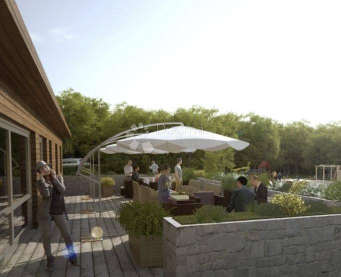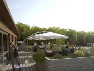 Vanjski Caffe Bar s prostranom terasom, pozicioniran s pogledom na buduće sportske terene, idealno je mjesto za dnevna druženja.