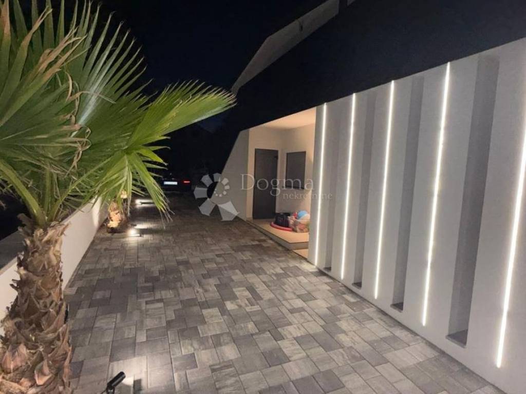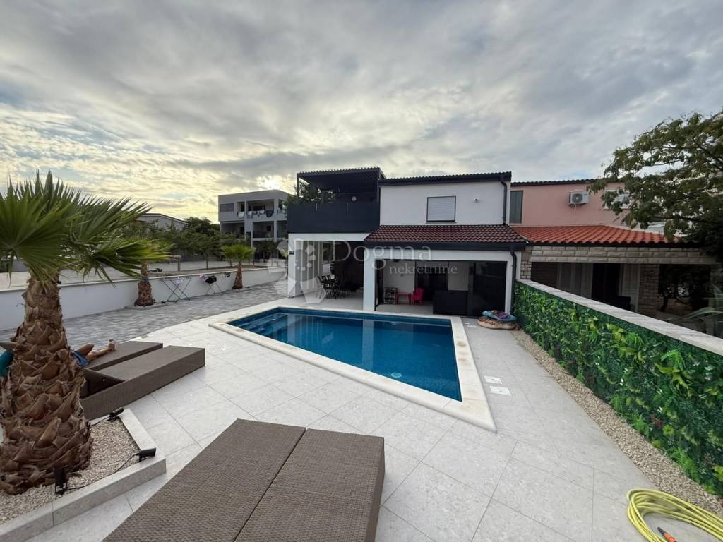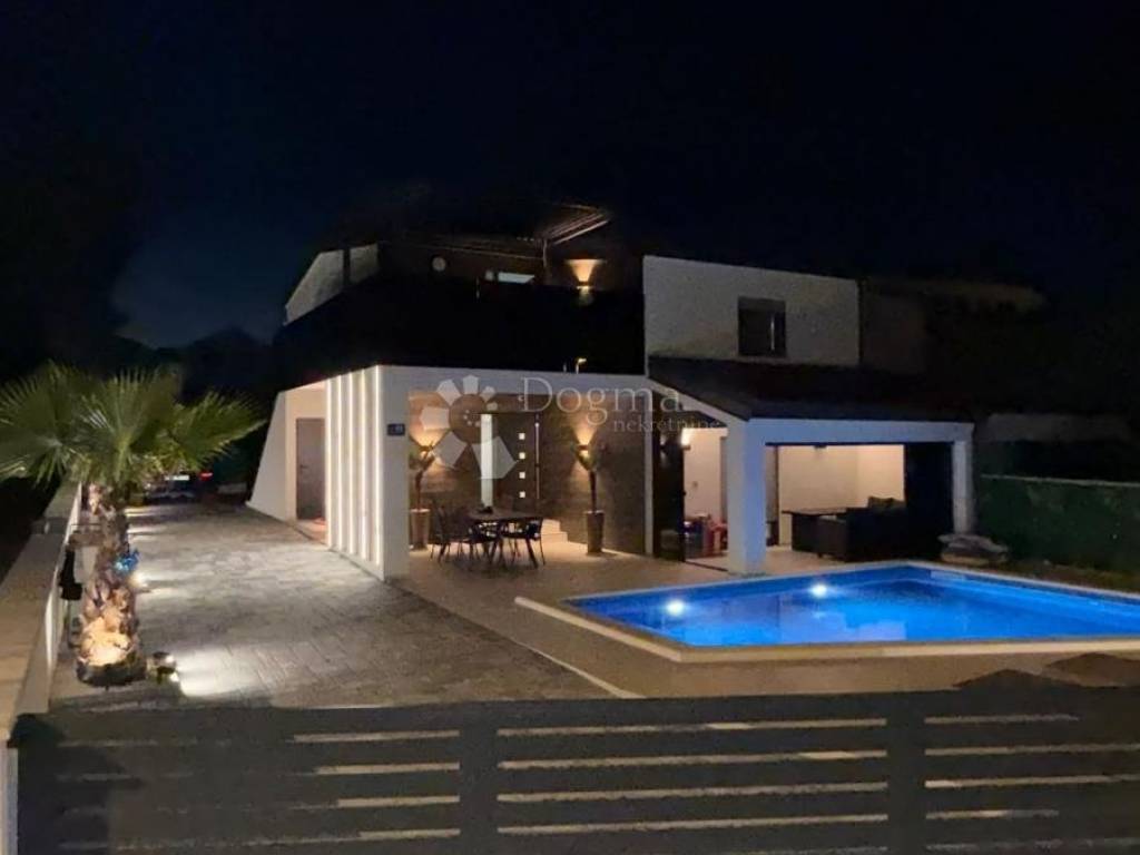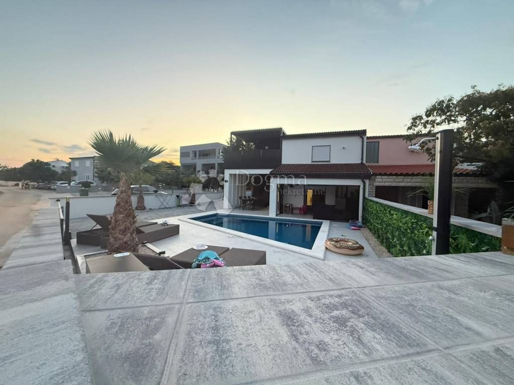 A modern villa of 344 m2 in total is for sale, consisting of 2 residential units, ground floor and first floor, made in top quality, meets all needs, 120 meters from the beach, for sale in the most frequented part of the island of Vir! Both living units consist of 2 bedrooms, living room/kitchen, bathroom/wc, storage room, covered and closed terrace. Underfloor heating, and air conditioning system. The apartments are for sale with high-quality furniture, quality equipment and an extremely pleasant atmosphere! The total area of the 2 apartments is 206m2. The yard also has an exclusive design, a 28m2 heated pool with sea water, a large stone barbecue, and a storage room. The exterior is surrounded by palm trees and olive trees. Ownership and papers are in order 1/1. Contact us with confidence, Nikola 0923827530