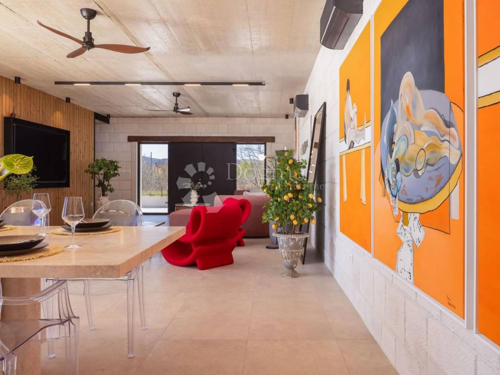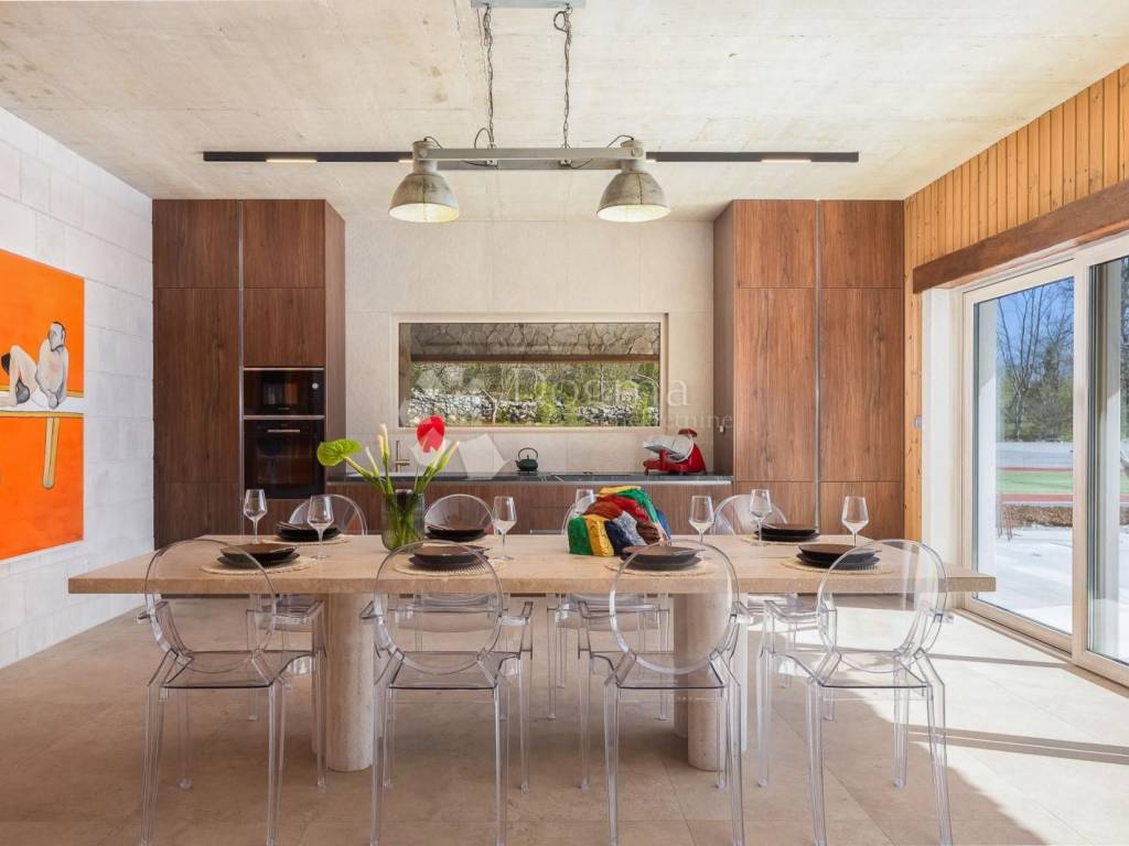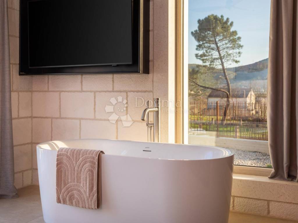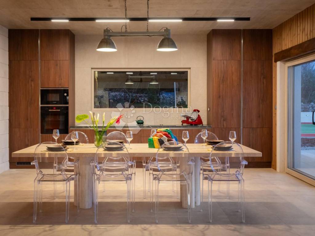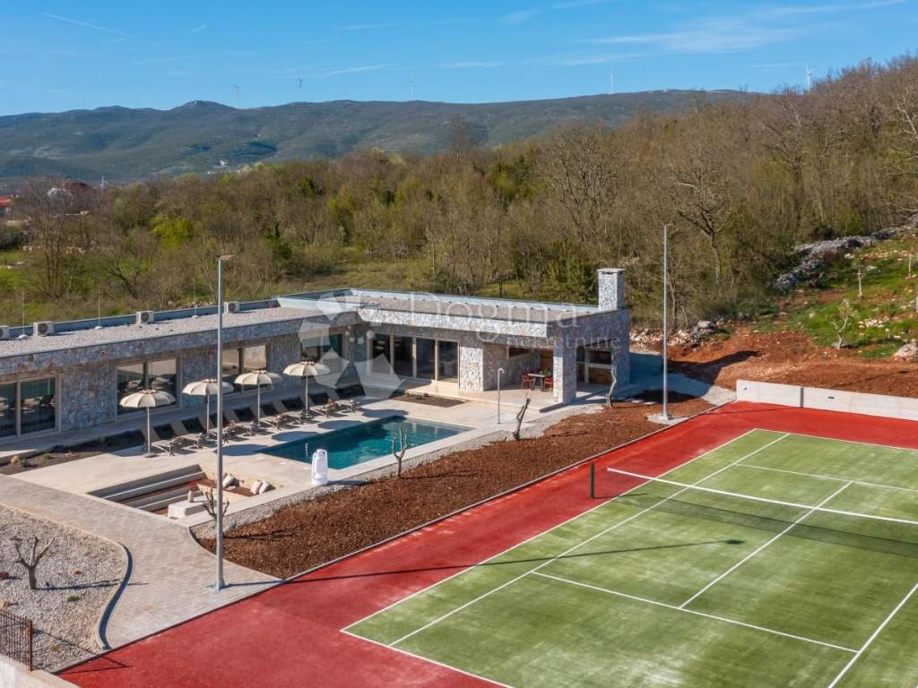 On a spacious plot of almost 3,000 m, surrounded by olive trees, there is a newly built villa that provides a perfect balance between seclusion and proximity to the city, for long-term rent The villa covers 240 m and is a combination of modern and traditional Dalmatian style. Glass walls connect the modern kitchen and dining room and the spacious living room with the outdoor terrace. Everything is equipped with top-quality furniture and artwork, and attention was paid to every detail: the house is fully air-conditioned, and has underfloor heating with the possibility of adjusting it by room. The villa also has four bedrooms with private bathrooms and access to a large covered terrace of 250 m, covered with natural stone, where there is a heated pool of 45 m with sun loungers, an outdoor shower with hot water and a Serbian toilet. Next to the pool there is also an outdoor kitchen with a grill, ideal for outdoor dinners. A private tennis court with artificial grass additionally contributes to the impression of luxury, as well as a landscaped garden with an automatic irrigation system, and the entire plot is walled with a forged fence with a remote-controlled gate. This villa is not only a peaceful oasis to escape from everyday life, but also an excellent investment with high potential for tourist rental. Whether you are looking for a vacation home, permanent residence or a business opportunity, this property offers a unique combination of natural beauty, privacy and superior comfort, all about 20 km from Split.