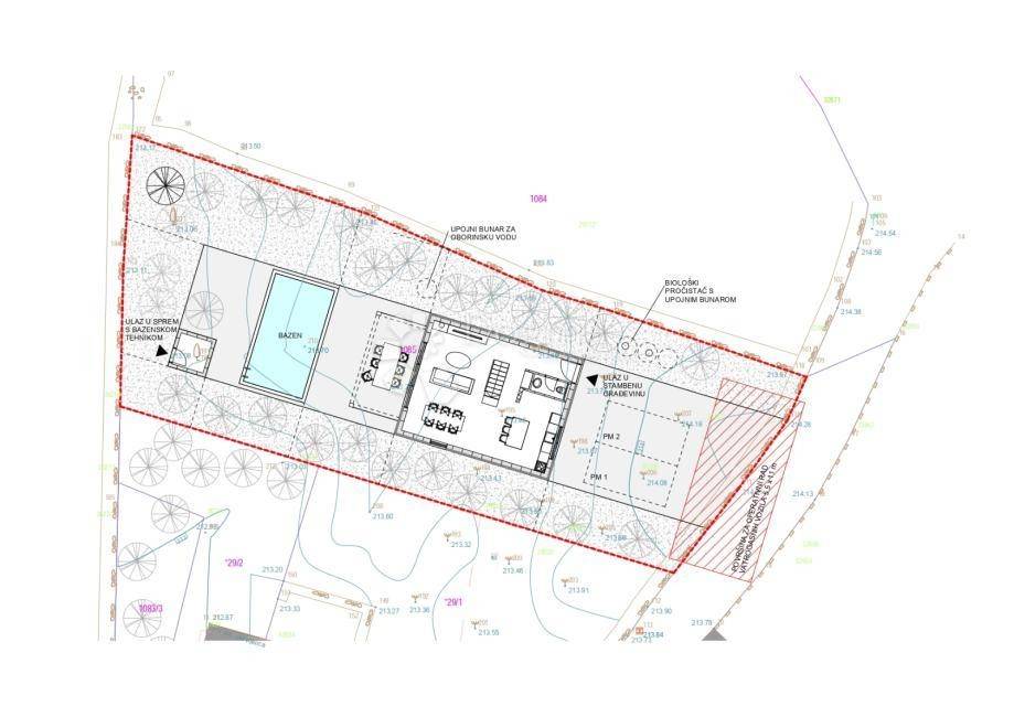 Projekt: Predviđena je izgradnja samostojeće stambene građevine s prizemljem i katom, vanjskog bazena (28 m), spremišta za bazensku tehniku, biološkog pročistača i dva parkirna mjesta.