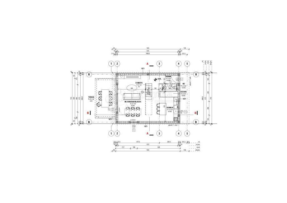 Prizemlje: Dnevni boravak, blagovaonica i kuhinja u open space konceptu, ostava, toalet i hodnik.