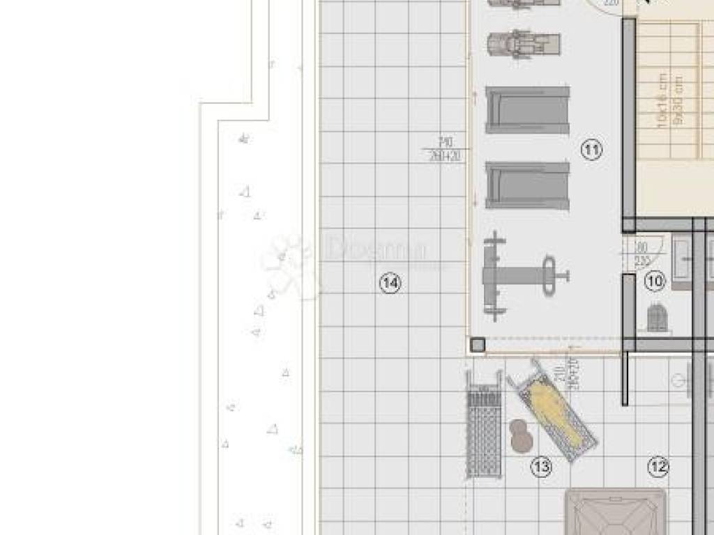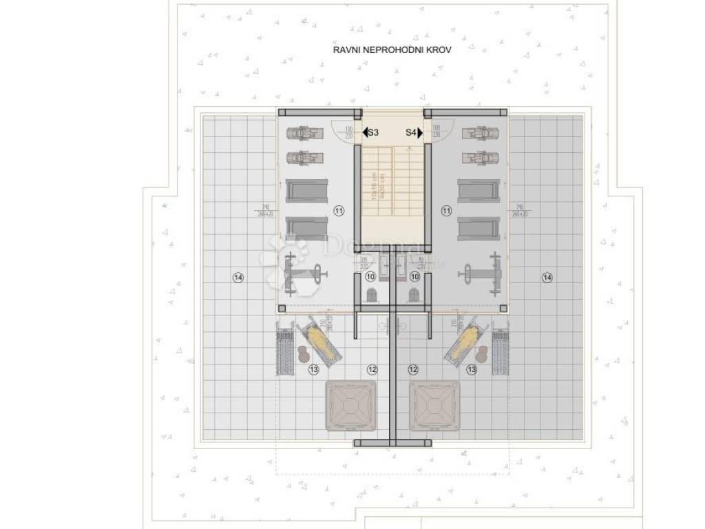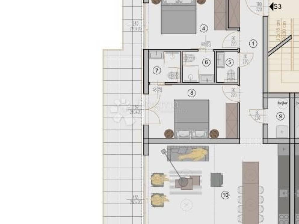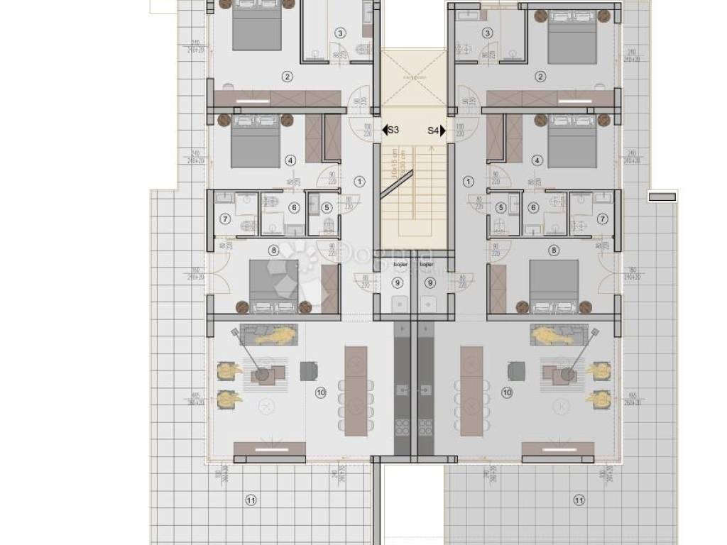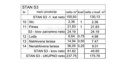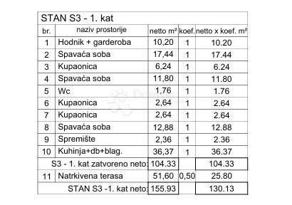 The apartment ''S3 - 1st floor'' consists of a hallway with a built-in wardrobe, 3 bedrooms each with their own bathroom, an additional toilet, a storage room, an open space living room with a kitchen and a dining room, a covered terrace that extends along the entire apartment and a roof terrace that is accessed by an internal staircase, and it contains a closed part with a toilet and a covered and uncovered part of the terrace that you can use in various ways as desired, such as fitness, jacuzzi, summer kitchen, barbecue...