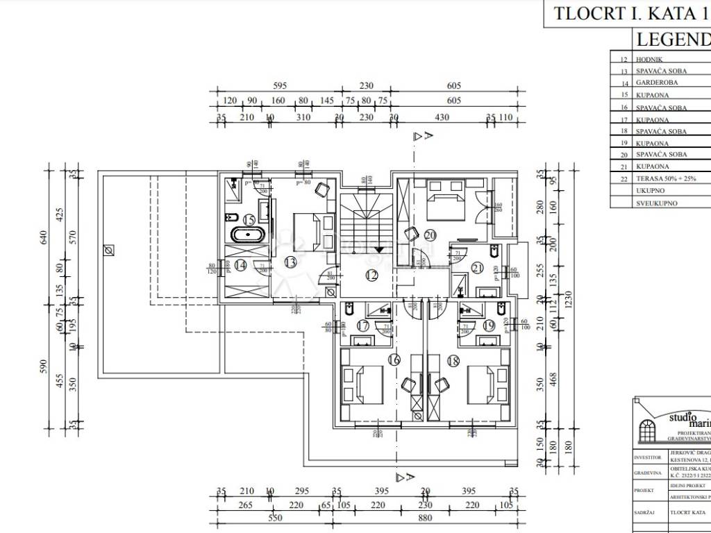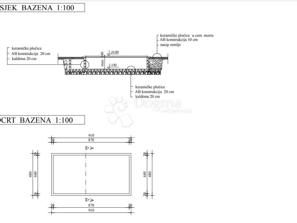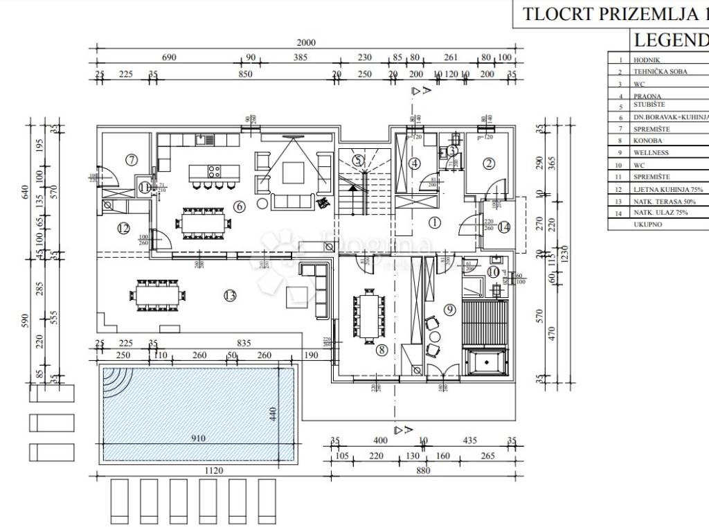 Građevinska dozvola je ishodovana na parceli od 1158 m za kuću/vilu s bazenom od 293 m, s 4 spavaće sobe koje su odvojene od kompletnog dnevnog dijela u prizemlju, a samim time je maksimalno osigurana privatnost.