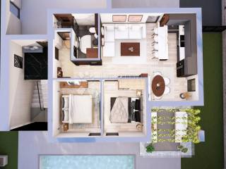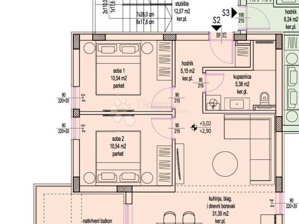 Apartment S2 consists of an entrance hallway, kitchen and living room, two bedrooms, and a bathroom, with a total area of 62.96m.