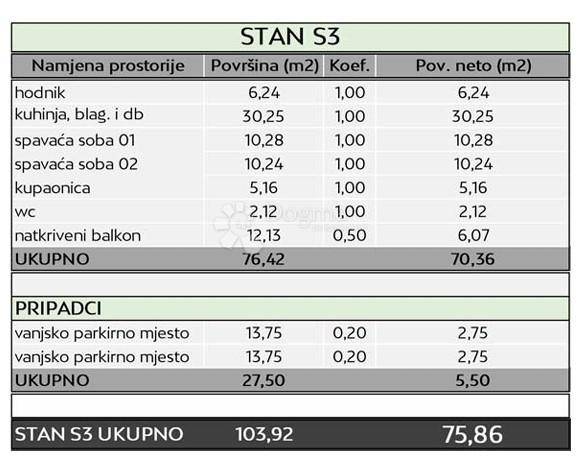 The total gross area of the apartment is 103.92 m, while the net sales area is 75.86 m.