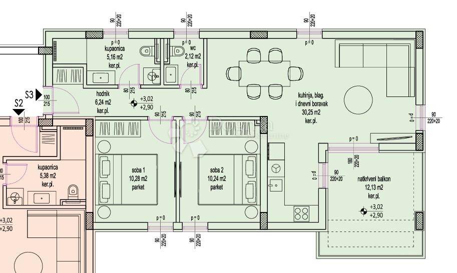 Apartment S3 consists of an entrance hallway, kitchen, and living room, two bedrooms, a bathroom, and a toilet, with a total area of 58.23 m.