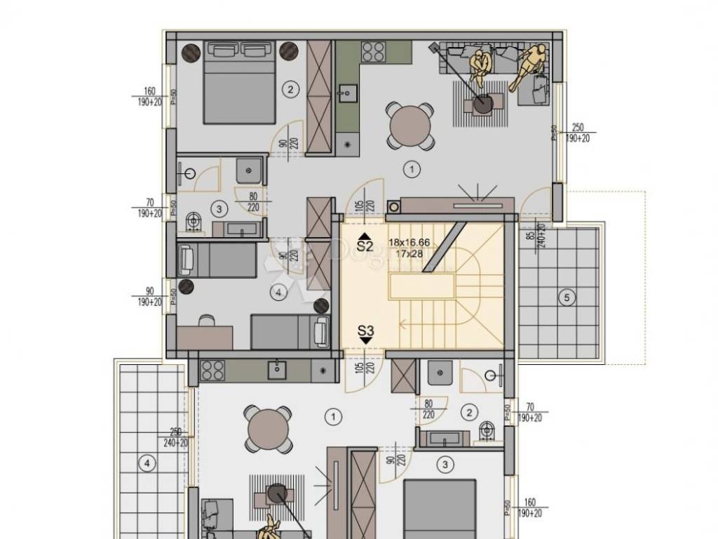 The new residential building consists of six buildings in a row, each with four apartments. The apartments on the ground floor have their own courtyard. Each apartment has a parking space, and there is also the option of purchasing a storage room. The apartments are equipped with underfloor heating, electric roller shutters, ceramic and laminate floors, sanitary ware and air conditioning. BUILDING 3 APARTMENT S3: - 1ST FLOOR - Total area: 42.29 m2 - 1 bedroom - bathroom - terrace - Living room, kitchen and dining room - Underfloor heating - PVC - triple-glazed glass - El. roller shutters NOTE: parking spaces and storage rooms are charged additionally. Possibility of purchasing a garage parking space. Expected completion planned for next year - 2026! 1/1 OWNERSHIP! For all questions or necessary information, please contact us at: Gabrijela Lovrinović Brokerage Assistant Mob: 097 7617 229 Email: gabrijela.lovrinovic@dogma-nekretnine.com Filip Crnjac Licensed Agent Mob: 091 6001 216