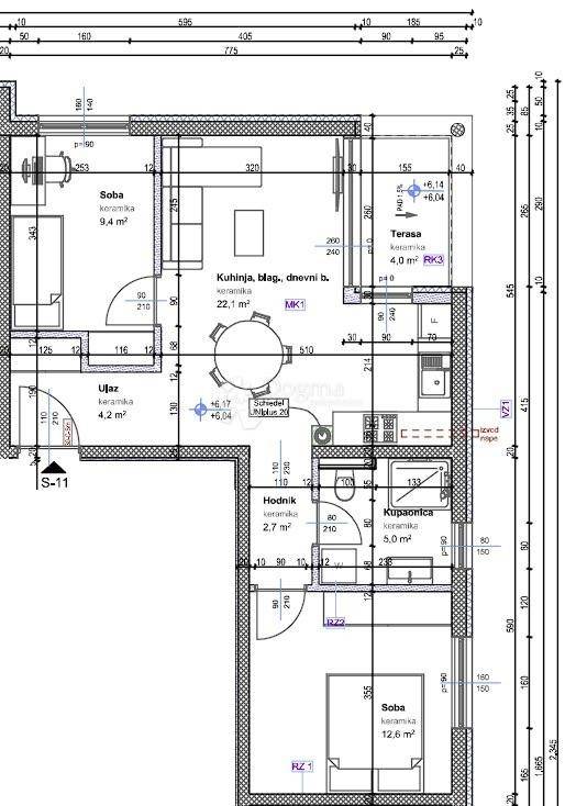 Apartment S11 has a total area of 61.90 m and is located on the second floor of the building. The apartment consists of two bedrooms, a living room with a dining area and kitchen, a bathroom, a hallway, a balcony, and a separate storage room. From the hallway, you enter the living room with a dining area and kitchen, from where you exit to the balcony.