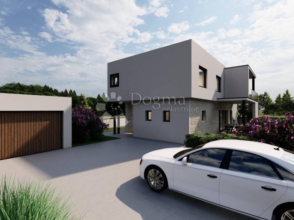 Ishođena je građevinska dozvola za građevinu stambene namjene i pomoćni objekt. Na fotografijama vizuali projekta te tlocrti prizemlja i kata.