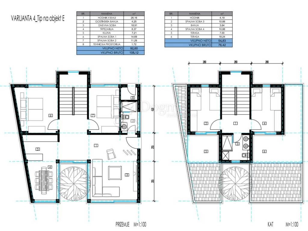 Na zemljištu je predviđena gradnja obiteljske kuće ukupne netto korisne površine 145,62 m, koja je raspoređena na prizemlje i prvi kat. Prizemlje, površine 104,09 m, sastoji se od ulaznog hodnika i komunikacijskog prostora, prostrane kuhinje s blagovaonicom i dnevnim boravkom otvorenog koncepta, dvije spavaće sobe, dvije kupaonice, dodatnog WC-a i tehničke sobe.