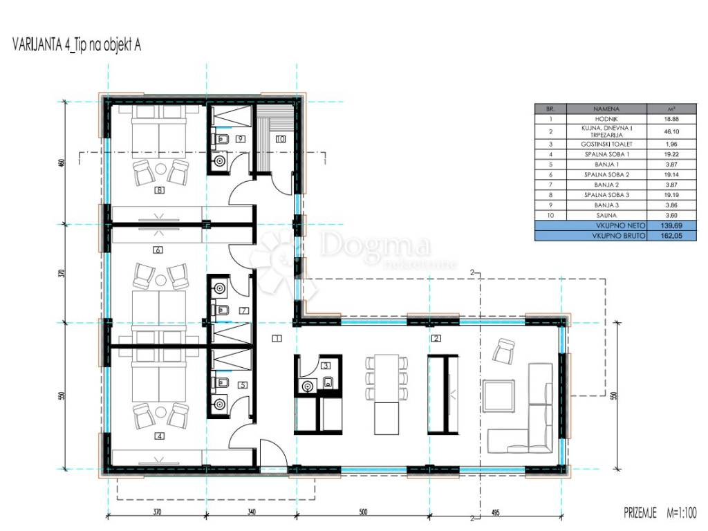 Na zemljištu je predviđena gradnja prizemne obiteljske kuće ukupne netto korisne površine 139,69 m. Sastoji se od ulaznog predsoblja, kuhinje sa blagavaonom i dnevnim boravkom otvorenog tipa, tri spavaće sobe, tri kupaonice, wc-a, saune i tehničke sobe.