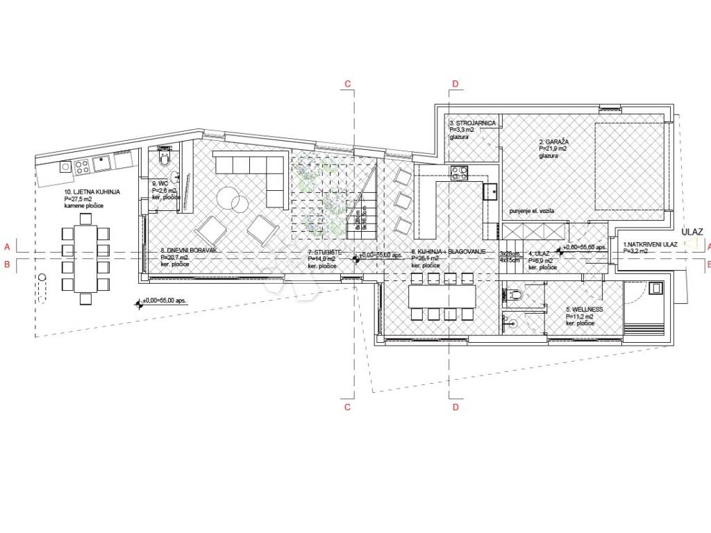 The ground floor includes an elegant entrance leading to a well-equipped wellness area for relaxation and recreation, a garage with a machine room, a modern kitchen with a dining area, and a spacious living room with large glass walls that open to an outdoor terrace. The terrace is equipped with a summer kitchen, perfect for outdoor gatherings, and has a separate guest WC for added convenience.