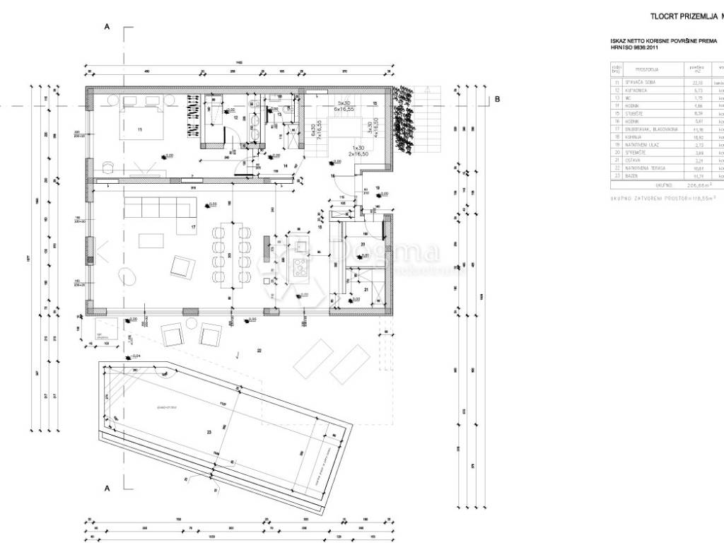 The basement, with an area of 122.22 m, will house a fitness room with a sauna, a pool machine room, a playroom, a laundry room, a bathroom, and another machine room.