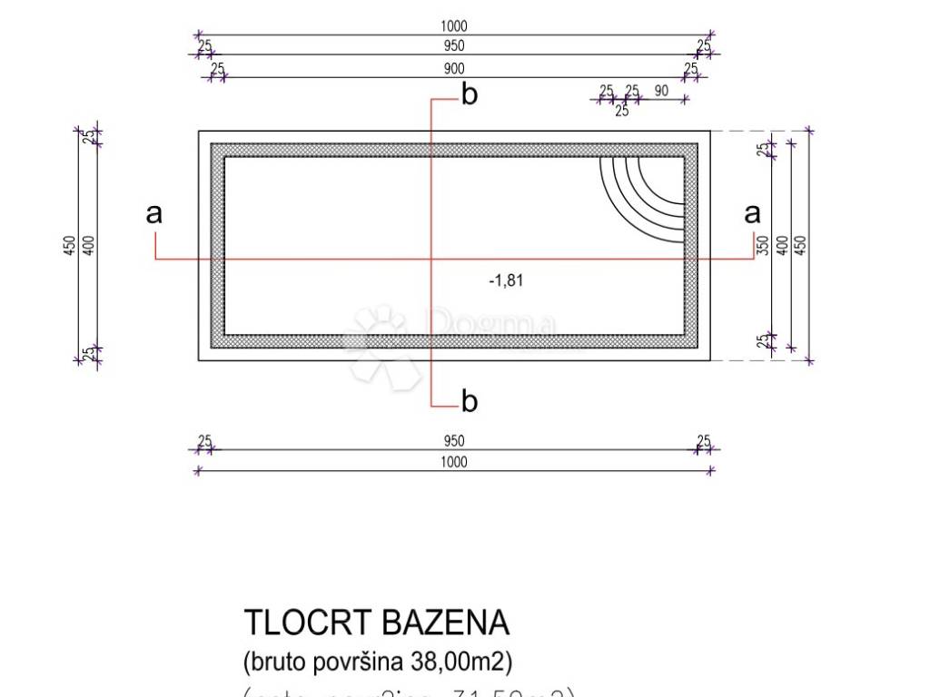 Na prodaju je zemljište sa građevinskom dozvolom za kuću sa bazenom koja se proteže na prizemlje i kat. Na terenu se nalaze priključci struje i vode te je sve spremno odmah za gradnju.