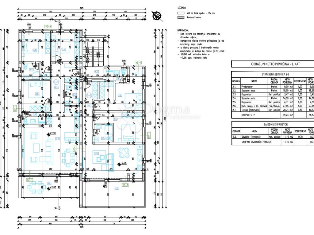 Apartment S2 is situated on the first floor and covers a total area of 126.22 m. The living area of 88.87 m consists of two bedrooms, one of which has its own bathroom, an additional separate bathroom, a hallway, and a spacious kitchen with a dining area and a living room that has access to a terrace of 20.74 m.