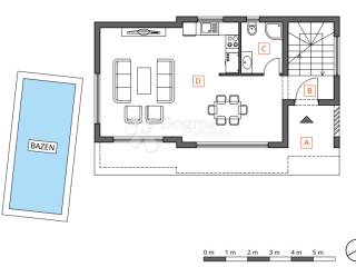 The ground floor of the house includes an entrance hall, a bathroom, an open space concept kitchen with a dining area and living room, which have access to a covered terrace and a yard with an area of 255.42 m. The yard also features a pool.