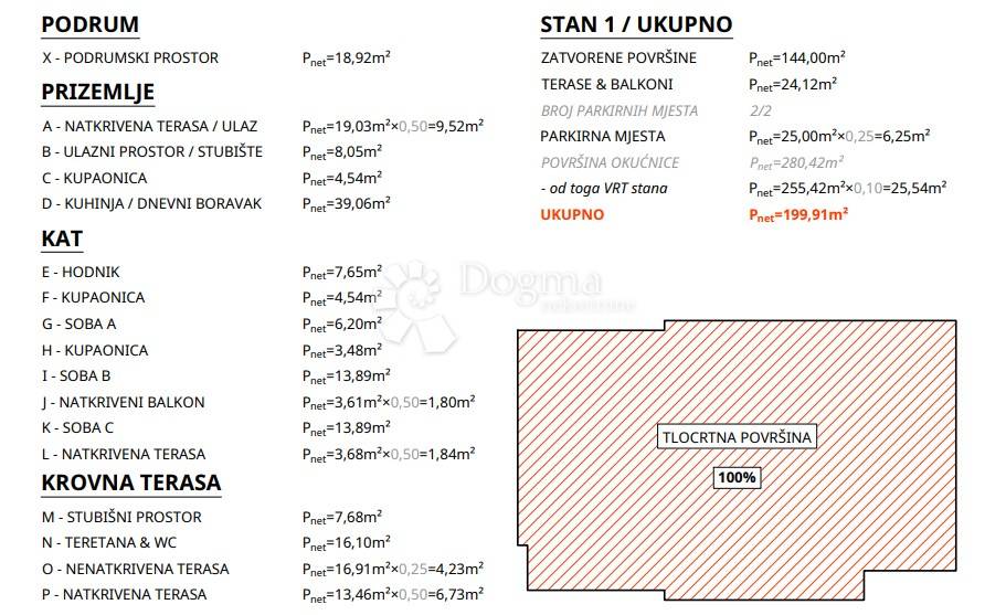 The internal enclosed space amounts to 144 m, while the remaining area consists of terraces, parking spaces, and a yard.
