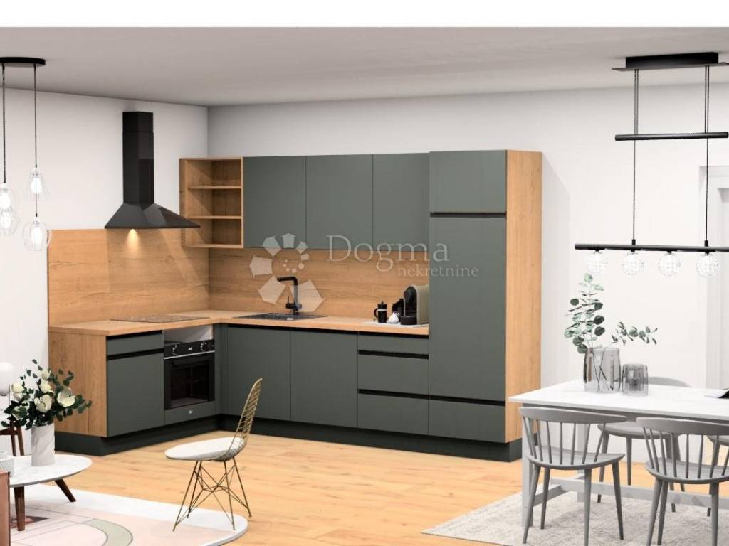 The apartment is located on the ground floor and consists of an entrance hall, open space living room, kitchen and dining room, 2 bedrooms, pantry, storage room/walk-in closet, terrace from which there is access to the garden of approx. 20 m2 and from which access to the common sun deck and the pool. The apartment also has 1 parking space.