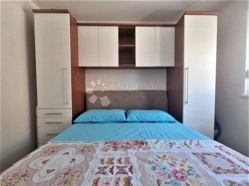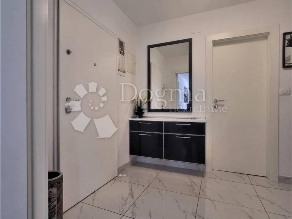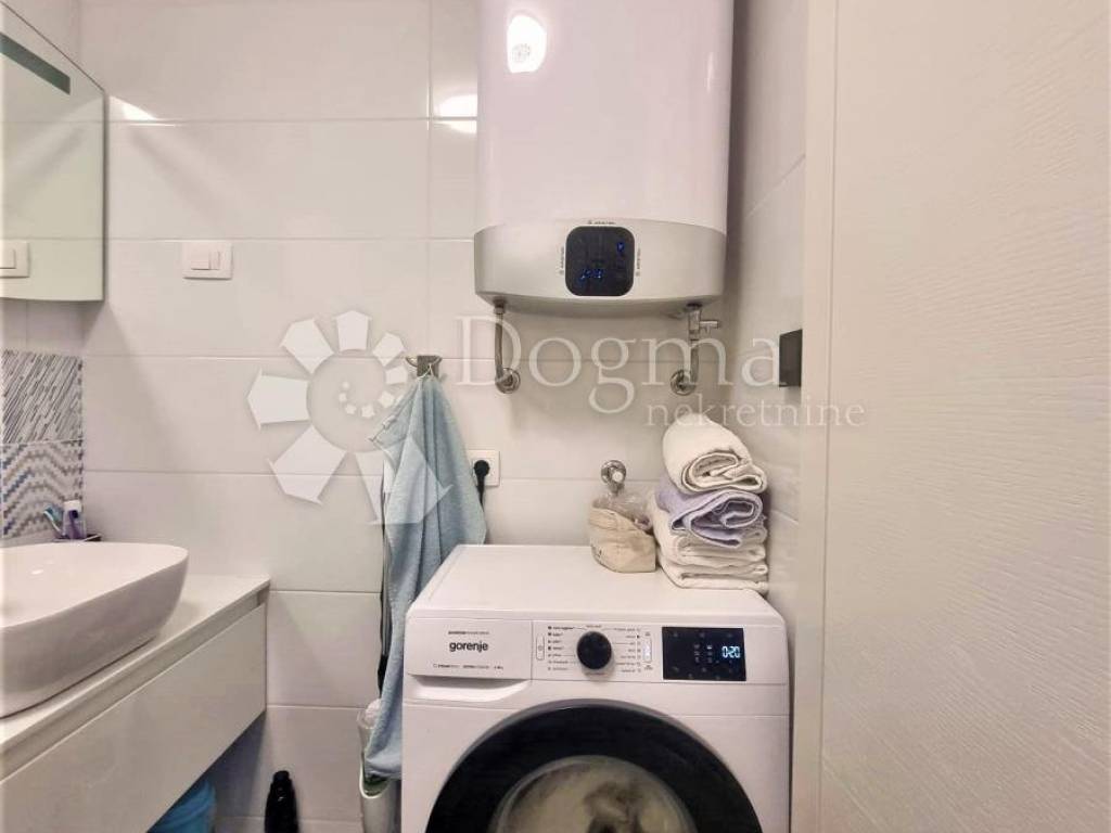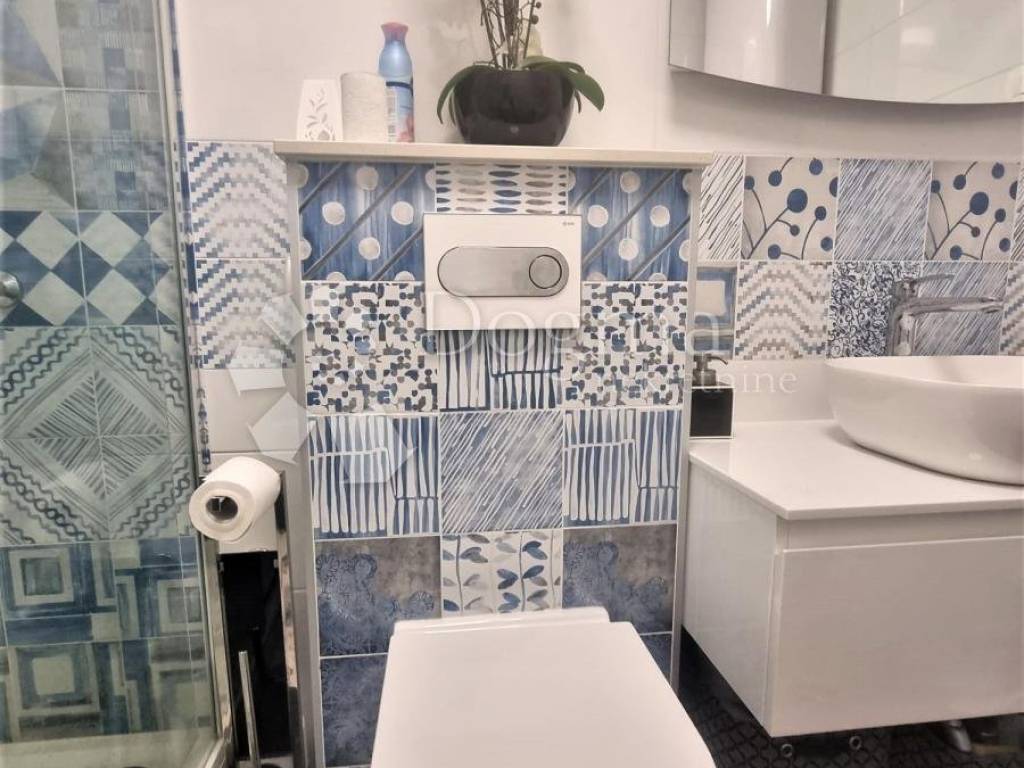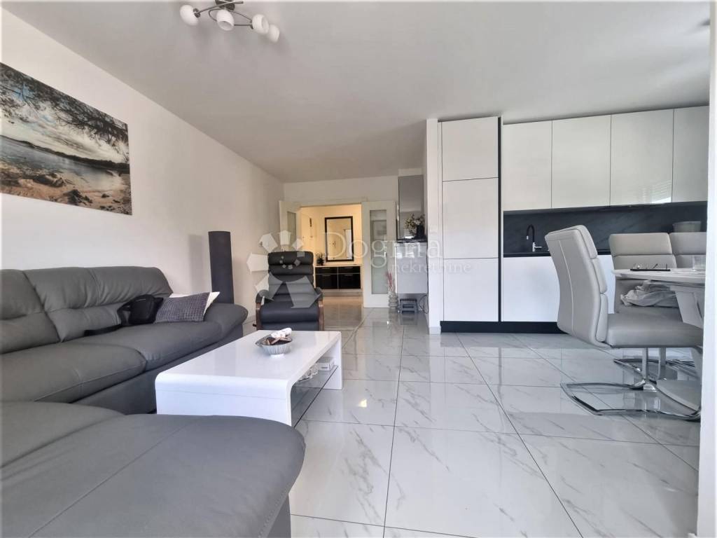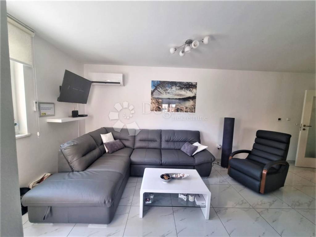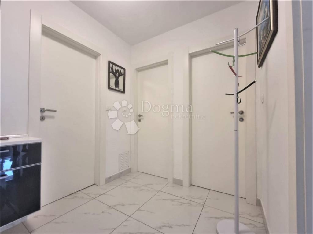 Upon entering the apartment, you can see that a lot of effort and money has been invested in it, from the ceramics itself to every detail in the interior decoration. The hallway is spacious and connects the kitchen and dining area, bedrooms and bathroom. Further down, on the left, there is a bathroom with a shower, a sink, a toilet bowl, a water heater and a washing machine. The bathroom is also luxuriously and modernly decorated. Further on, the corridor leads to two bedrooms, one next to the other. Each bedroom consists of a double bed with accompanying bedside tables and wardrobes.