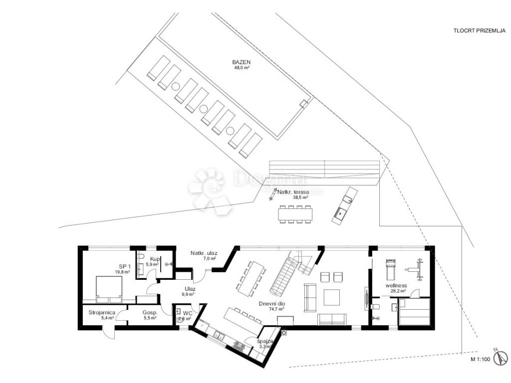 Natkriveni ulaz vodi Vas do open space dnevnog boravka sa blagovaonom i kuhinjom, izlazom na natrkivenu i otkrivenu terasu, toaleta, ostave, spavaće sobe sa vlastitom kupaonom, strojarnicom i wellnessom.