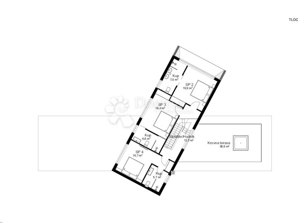 Na katu se nalaze joiš 3 spavaće sobe sa pripadajućim kupaonama te izlazom na prostranu krovnu terasu površine 39 m2.