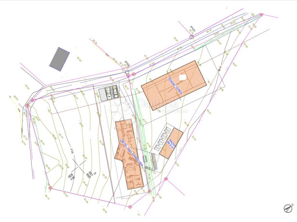 Ukupne površine 2016m2 s projektom vile sa sunčalištem, bazenom površine 48 m2 i teniskim terenom i parkingom za tri automobila.