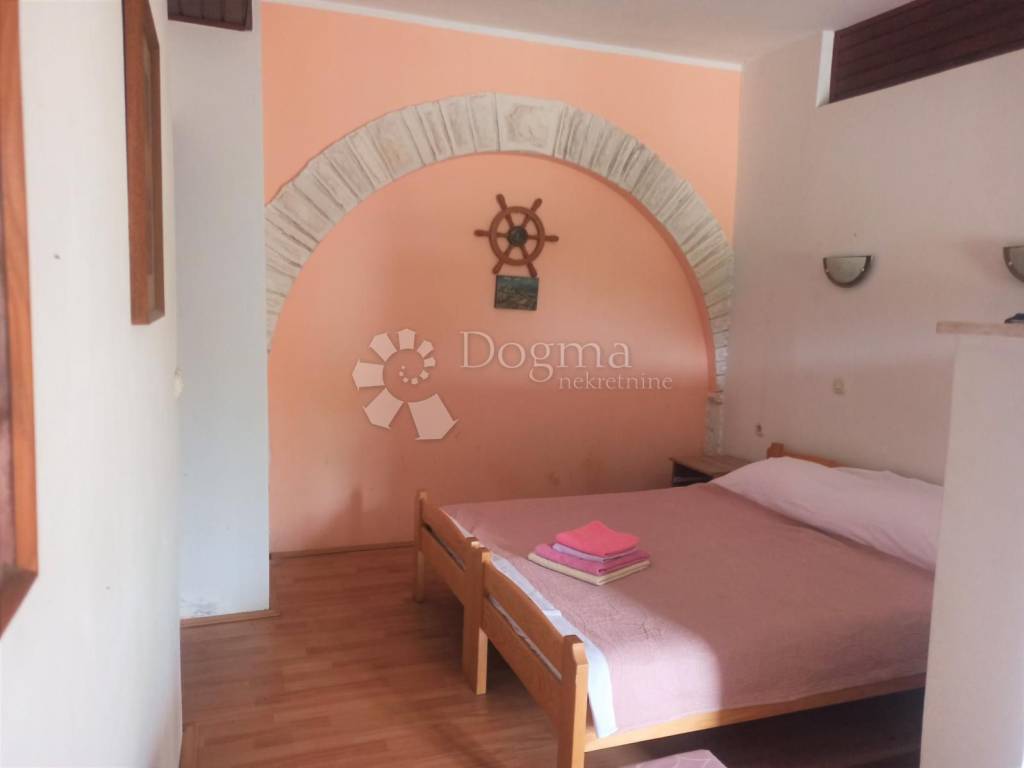 A spacious apartment house on two floors is located right in this place on the coast by the sea. In the lower part, there are two one-bedroom and one two-bedroom apartments, a storage room and a restaurant with a main and auxiliary kitchen and a spacious terrace that once worked very well. On the first floor, there are three more two-room apartments and one studio with a view of the sea through the treetops. Within the house there are several parking spaces connected by a common garden. The location of the property itself is close to all the necessary tourist facilities, the most famous beaches and shops, which enables this house to be very successful and profitable in the tourism industry.