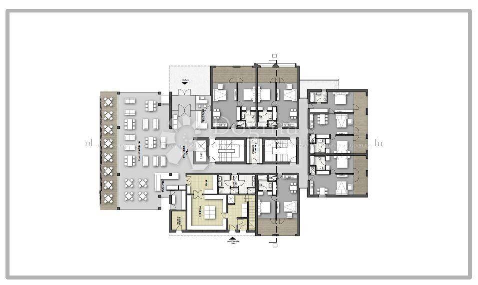 PRIZEMLJE: prizemlje je namijenjeno ulaznom prostoru sa recepcijom i prijamnim holom te manjem restoranu sa kuhinjom. U prizemlju je smješteno i 5 smještajnih jedinica sa predvrtovima.