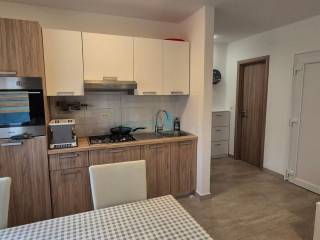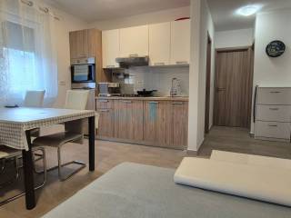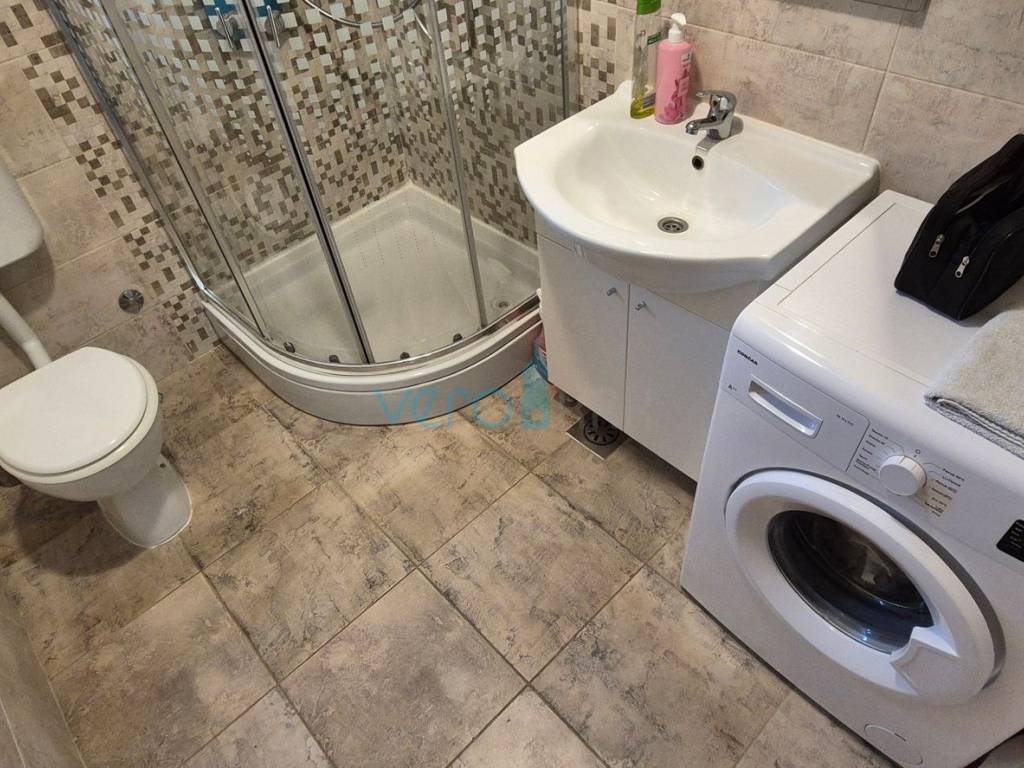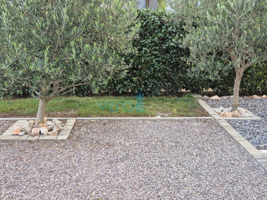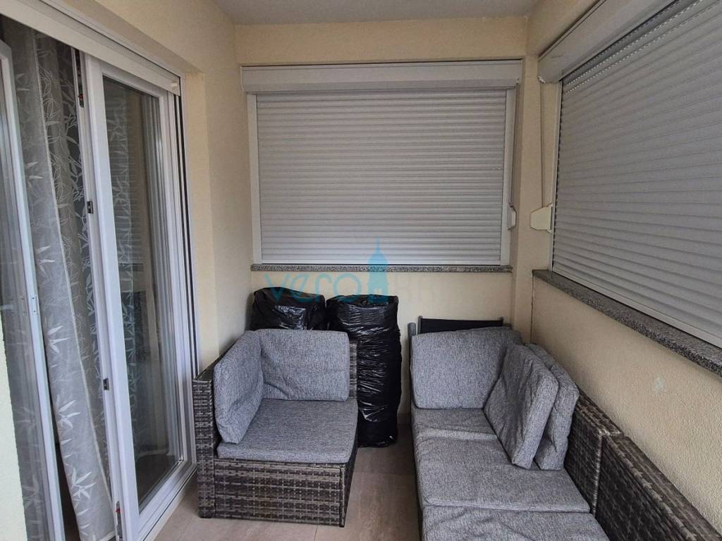 The two-bedroom apartment of 56.13 m2 is located on the ground floor of a residential building with 6 apartments. It consists of a hallway, storage room, living room with kitchen and dining area, two bedrooms, bathroom, and an enclosed terrace. The apartment includes a large, landscaped yard of 129 m2 and one covered parking space of 12 m2. The apartment is sold fully furnished with white goods and all appliances.