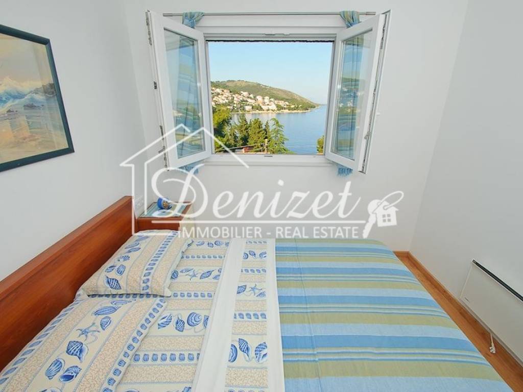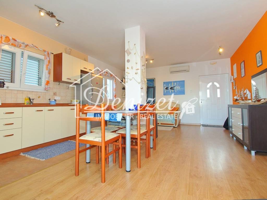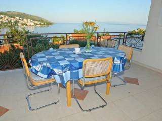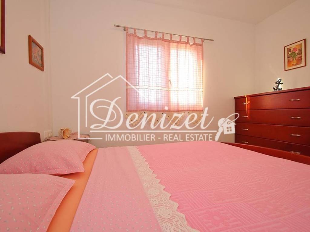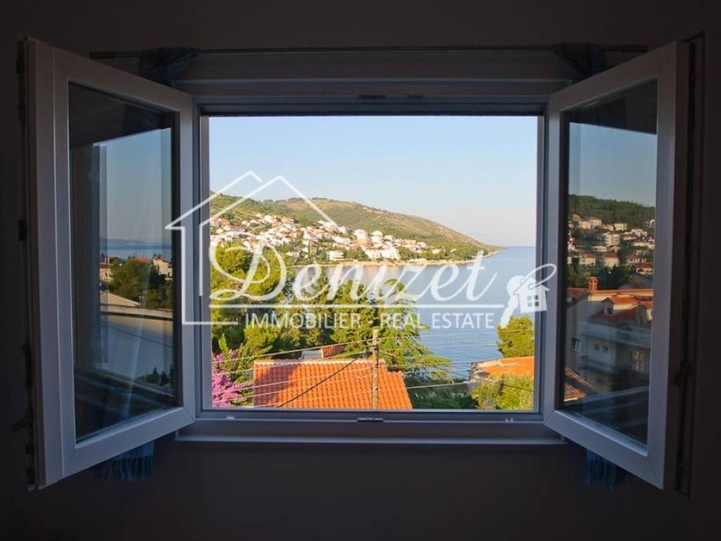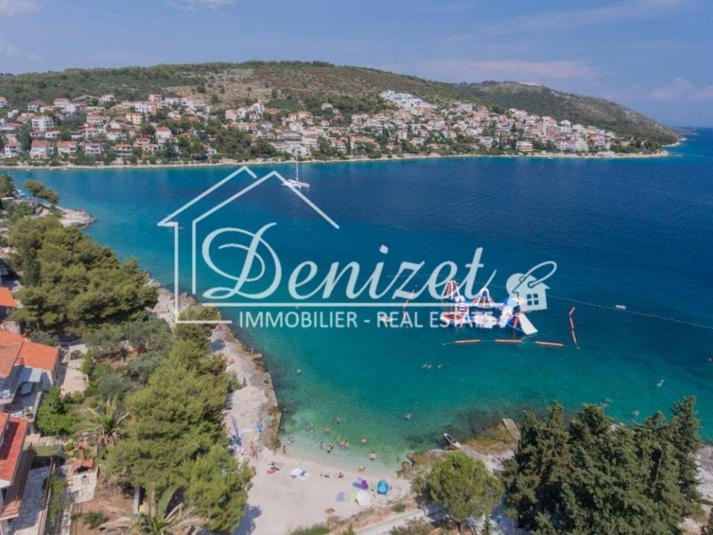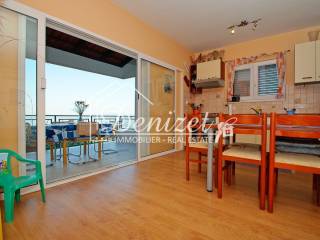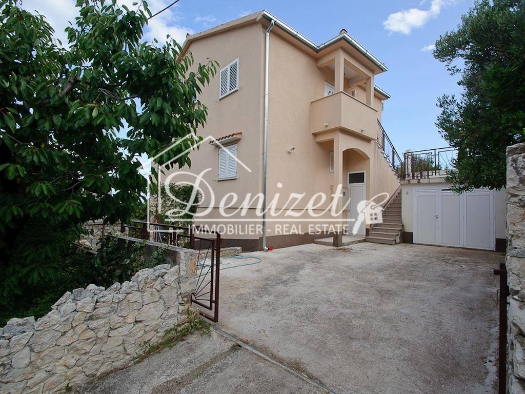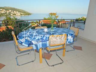 The apartment is located on the first floor of a family house consisting of a basement, ground floor and first floor. There are three residential units in total. The apartment in question contains two bedrooms, a bathroom, a dressing room, a living room with a kitchen, a total floor area of 52.29 m2, and the associated ancillary parts: a balcony, a loggia and a terrace with a total floor area of 43.89 m2, an external staircase with a total floor area of 5.78 m2, a garage with a total floor area of 26.03 m2, and a garden in front of the house, which has been converted into a parking space with an area of approximately of 48 m2. The total area of the apartment including the ancillary, associated parts is 176 m2. The living room leads to a spacious loggia (15 m2) with a beautiful open sea view. On the southwest side of the house there is a beautiful terrace of 26 m2. The house was built in 1990 and is in a well-maintained and very tidy condition. Below the house there is a well-maintained pebble beach, just 80 m away, or a 1-minute walk. The apartment is ideal for living, as well as for tourist rental. It has a separate entrance and offers complete privacy. Depending on the tastes of the future owner, the apartment can be modernized and furnished according to their own wishes, but it is sold in a very neat, well-maintained condition and is ready to move in. The house in which the apartment is located has all the necessary legal documentation. The distance from the center of the village is 700 m, from the international airport Split 9 km, from the center of Trogir 6 km.