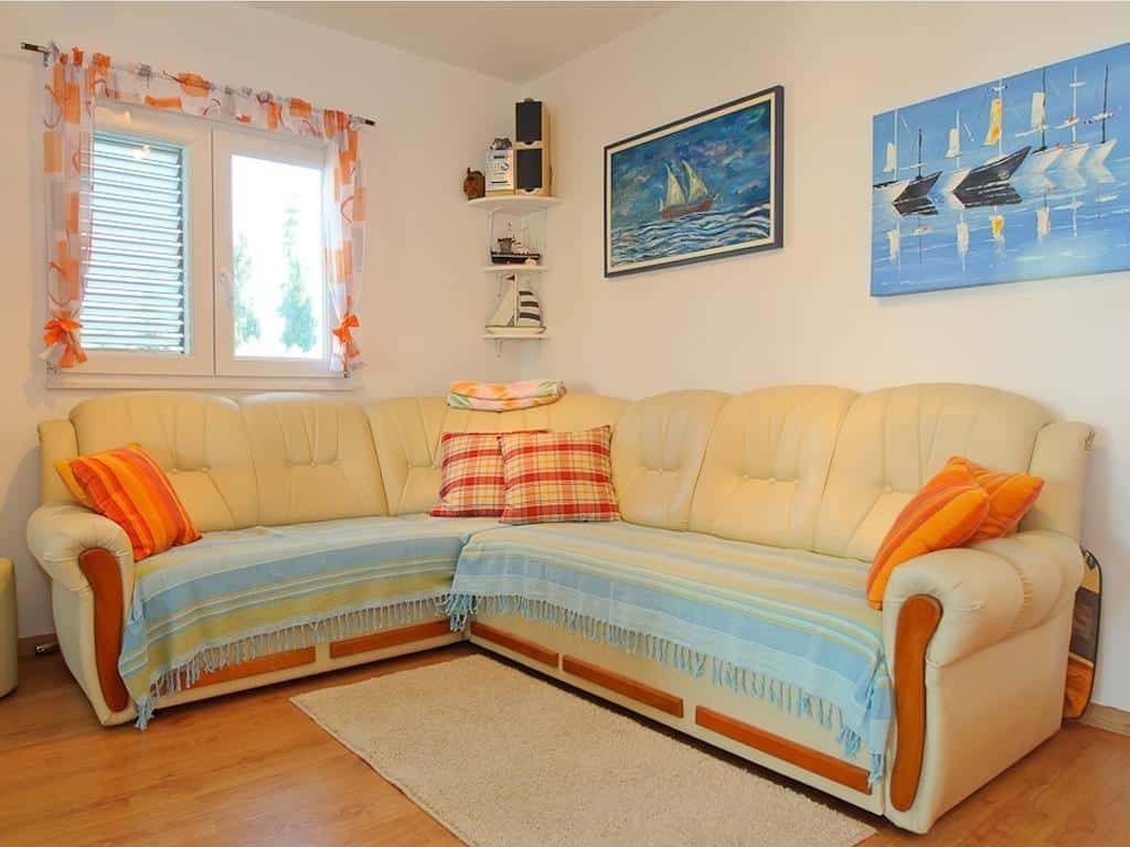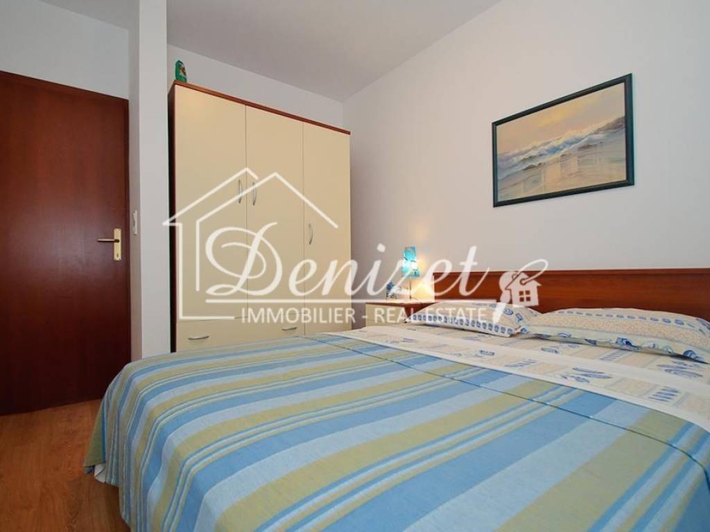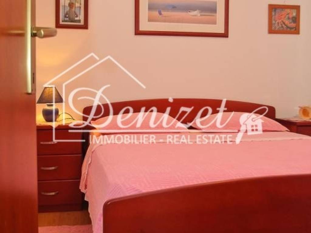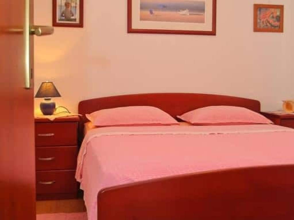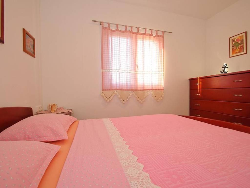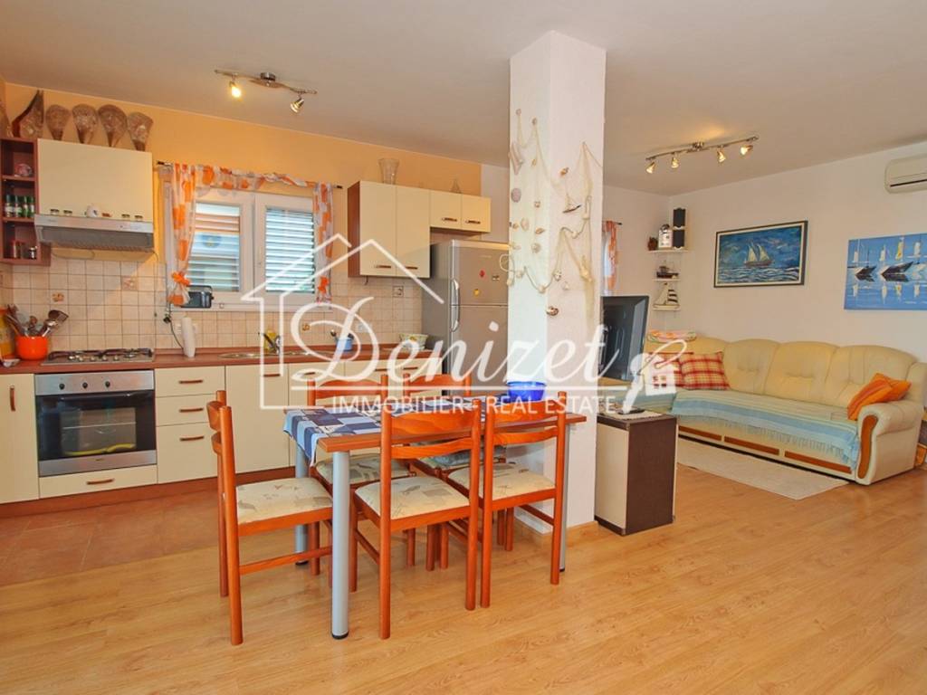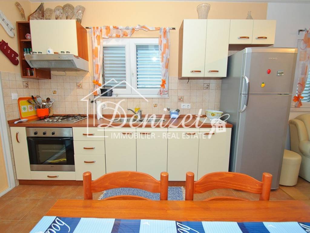 The apartment is located on the first floor of a family house consisting of a basement, ground floor and first floor. There are three residential units in total. The apartment in question contains two bedrooms, a bathroom, a dressing room, a living room with a kitchen, a total floor area of 52.29 m2, and the associated ancillary parts: a balcony, a loggia and a terrace with a total floor area of 43.89 m2, an external staircase with a total floor area of 5.78 m2, a garage with a total floor area of 26.03 m2, and a garden in front of the house, which has been converted into a parking space with an area of approximately of 48 m2. The total area of the apartment including the ancillary, associated parts is 176 m2. The living room leads to a spacious loggia (15 m2) with a beautiful open sea view. On the southwest side of the house there is a beautiful terrace of 26 m2. The house was built in 1990 and is in a well-maintained and very tidy condition. Below the house there is a well-maintained pebble beach, just 80 m away, or a 1-minute walk. The apartment is ideal for living, as well as for tourist rental. It has a separate entrance and offers complete privacy. Depending on the tastes of the future owner, the apartment can be modernized and furnished according to their own wishes, but it is sold in a very neat, well-maintained condition and is ready to move in. The house in which the apartment is located has all the necessary legal documentation. The distance from the center of the village is 700 m, from the international airport Split 9 km, from the center of Trogir 6 km.