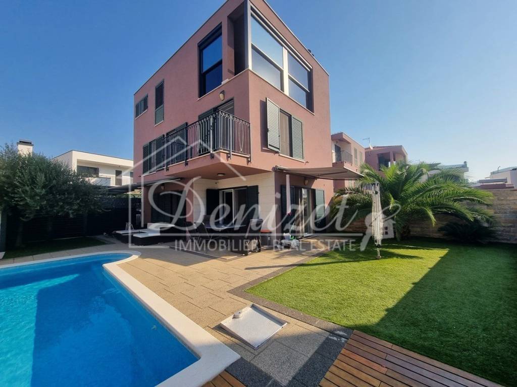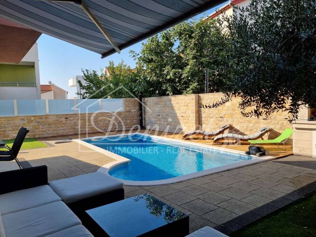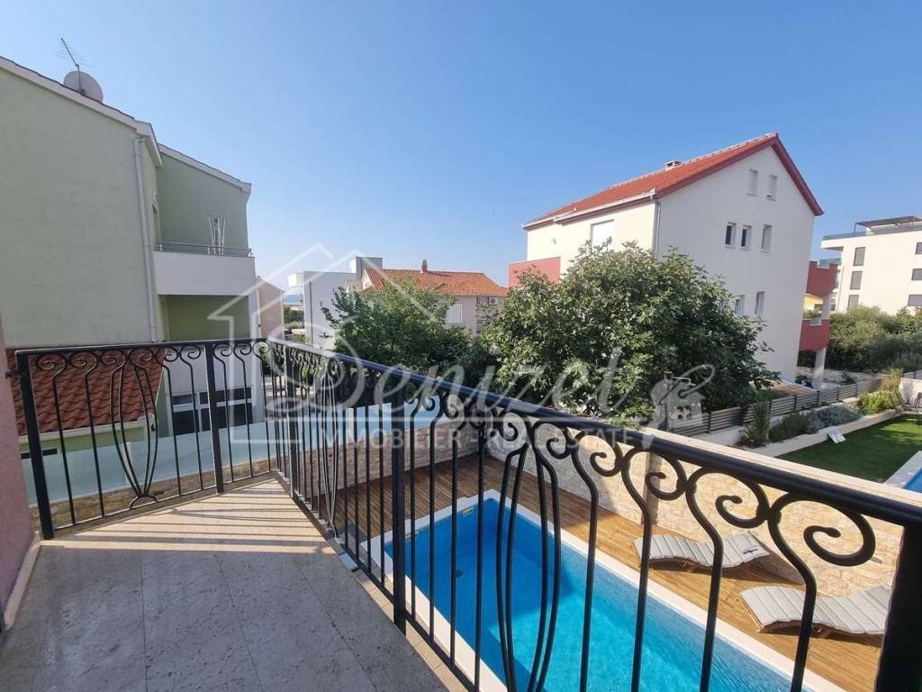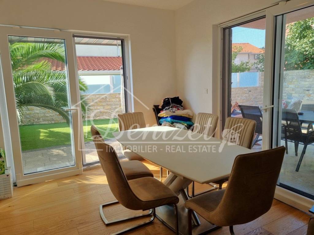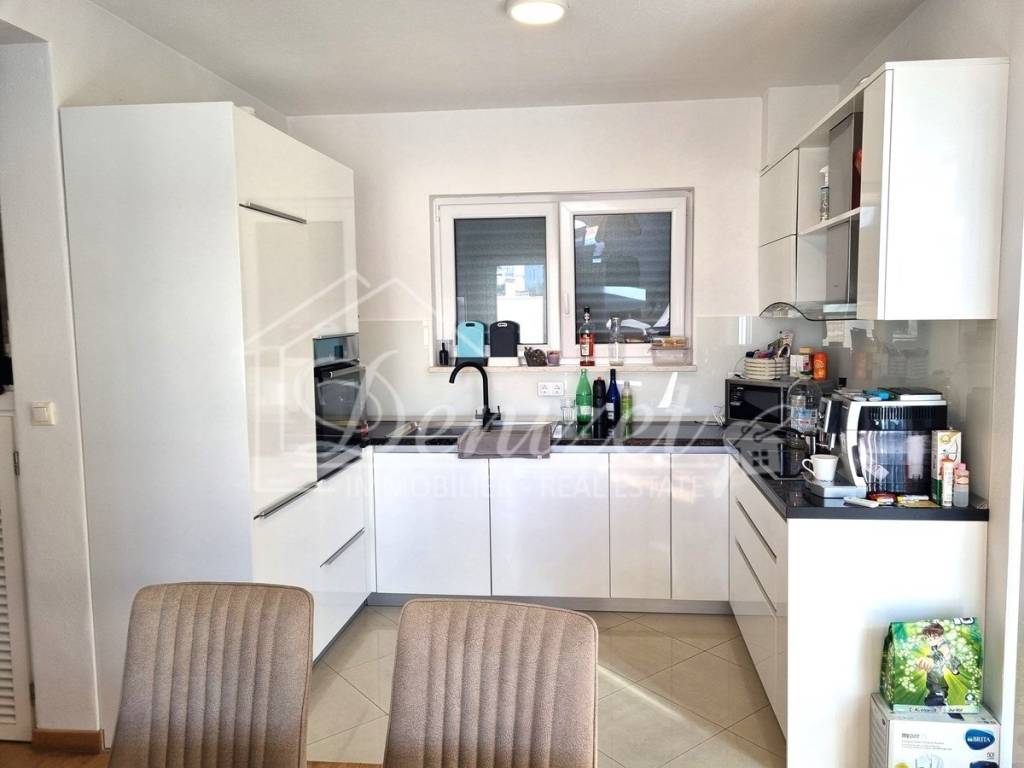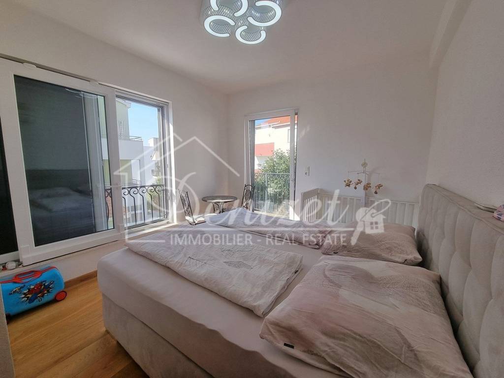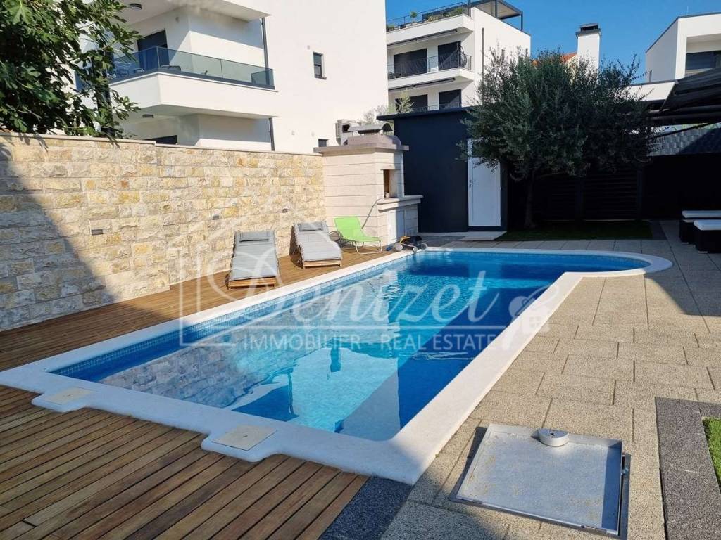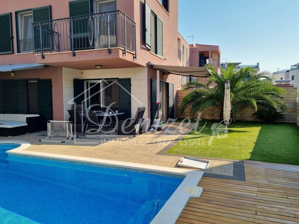 Spacious duplex apartment in a smaller residential building with a total of three residential units is for sale. The apartment is spread over the ground floor and first floor. The ground floor consists of a large living room, kitchen, dining room, storage and toilet. An internal staircase leads to the 1st floor, which contains a hallway, three bedrooms and two bathrooms. One of the bedrooms has a wardrobe, access to the bathroom and access to a small balcony. From the ground floor there is an exit to a spacious and landscaped garden with a swimming pool, sunbathing area, outdoor grill and storage room. The apartment has a total living area of 98.74 m2, with a garden of 150 m2 and a balcony of 3.84 m2. It also has one covered parking space. The apartment is fully furnished and equipped and is being sold as such. Modern apartment, very well maintained and warm space full of light. There is electric underfloor heating throughout the apartment, and all rooms are air-conditioned. It is ideal for living, for vacation, but also as a rental property for tourist purposes. The apartment is oriented towards the southwest. The air distance from the sea and the beach is only 250 m. It is also 4 km away from Trogir, 9 km from Split airport, and 30 km from the Split city center.