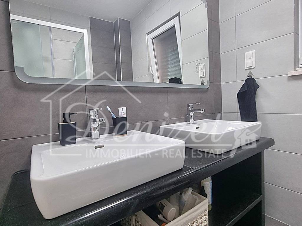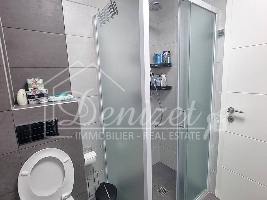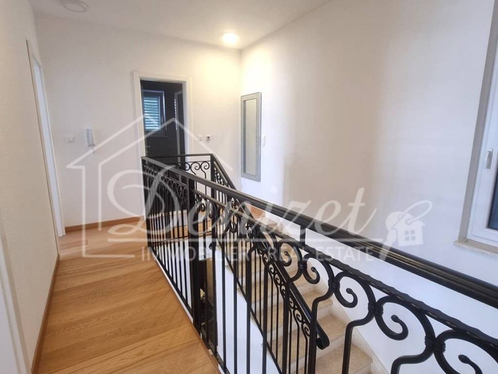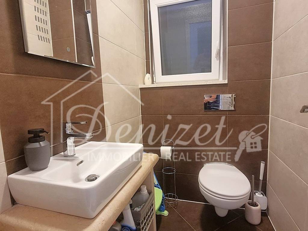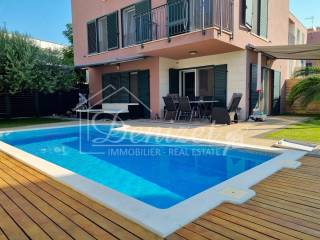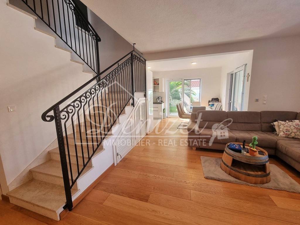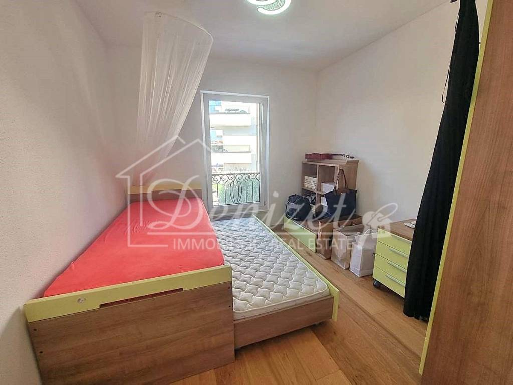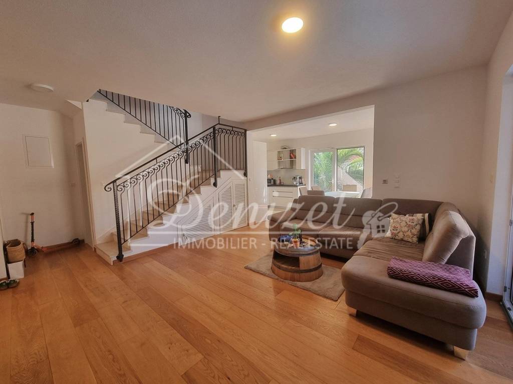 Spacious duplex apartment in a smaller residential building with a total of three residential units is for sale. The apartment is spread over the ground floor and first floor. The ground floor consists of a large living room, kitchen, dining room, storage and toilet. An internal staircase leads to the 1st floor, which contains a hallway, three bedrooms and two bathrooms. One of the bedrooms has a wardrobe, access to the bathroom and access to a small balcony. From the ground floor there is an exit to a spacious and landscaped garden with a swimming pool, sunbathing area, outdoor grill and storage room. The apartment has a total living area of 98.74 m2, with a garden of 150 m2 and a balcony of 3.84 m2. It also has one covered parking space. The apartment is fully furnished and equipped and is being sold as such. Modern apartment, very well maintained and warm space full of light. There is electric underfloor heating throughout the apartment, and all rooms are air-conditioned. It is ideal for living, for vacation, but also as a rental property for tourist purposes. The apartment is oriented towards the southwest. The air distance from the sea and the beach is only 250 m. It is also 4 km away from Trogir, 9 km from Split airport, and 30 km from the Split city center.