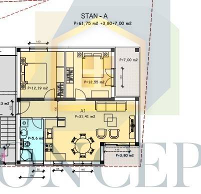 The apartment will have an area of 72 m and will also include a garden of 150 m. It will consist of an entrance hallway, a kitchen with a dining area, and a living room with access to a terrace. To the right of the entrance, there is a planned bathroom, and to the left, there are two bedrooms, one of which has access to the terrace.